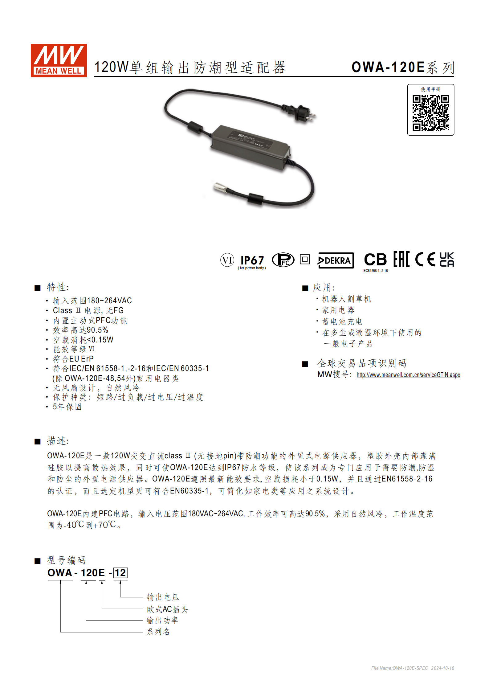 明緯 OWA-120E 系列是120W 單組輸出防潮型適配器,具備IP67防水等級(jí),輸入電壓范圍180~264VAC,內(nèi)置主動(dòng)式 PFC 功能,效率最高達(dá)90.5%、空載消耗 **<0.15W且能效等級(jí) Ⅵ,無風(fēng)扇自然風(fēng)冷設(shè)計(jì),擁有短路 / 過負(fù)載 / 過電壓 / 過溫度四重保護(hù),工作溫度-40~+70℃,塑膠外殼灌硅膠提升散熱,適配機(jī)器人割草機(jī)、家用電器等多塵潮濕環(huán)境的設(shè)備,除 48/54V 機(jī)型外均符合 EN60335-1 家電標(biāo)準(zhǔn),提供5 年保固 **,全系列為 Class Ⅱ 無接地設(shè)計(jì)。