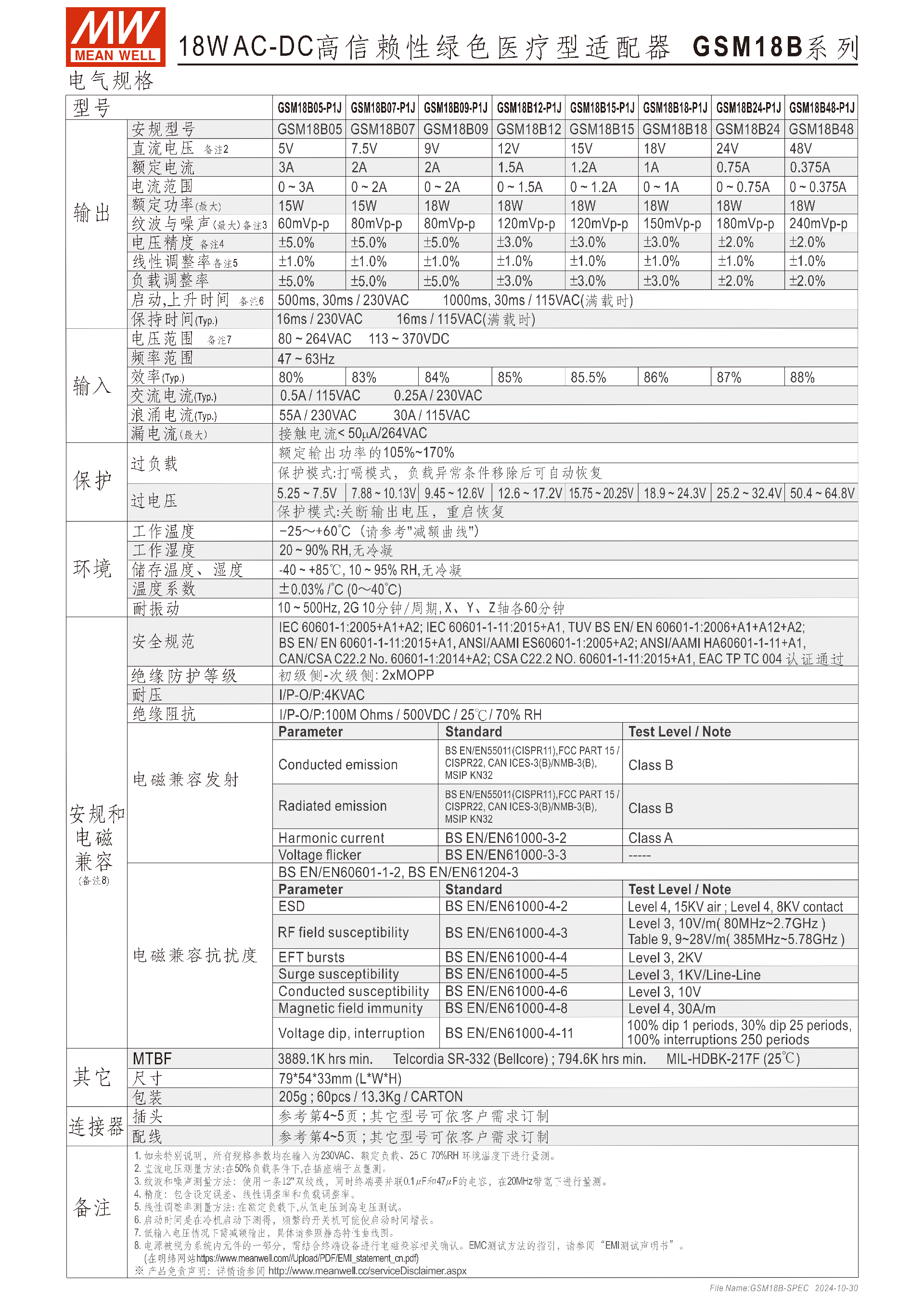 編碼從右至左 / 核心字段定義:18(額定功率)-P1J(IEC320-C8 2pin AC 插頭)-GSM(系列名)-B05(輸出電壓,示例)- 后綴(DC 插頭類型),DC 插頭類型可根據(jù)客戶需求定制(參考產(chǎn)品 4~5 頁)。