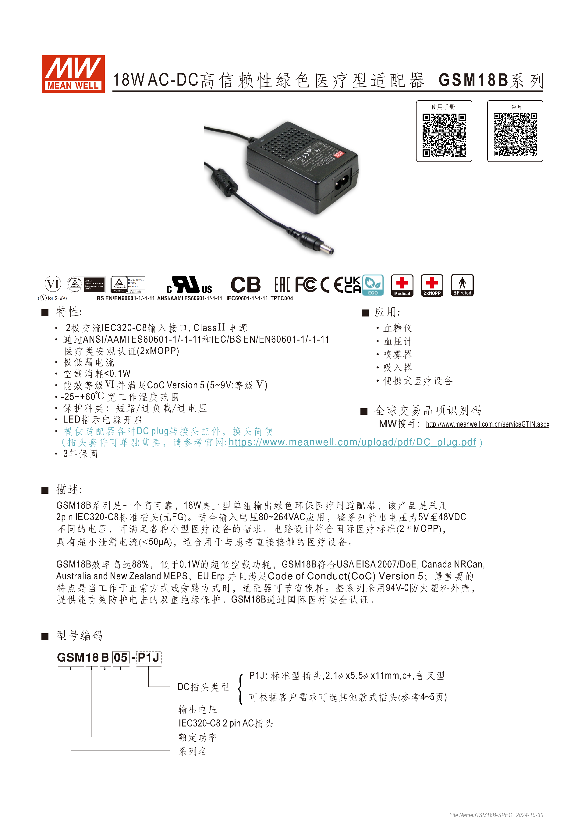 編碼從右至左 / 核心字段定義:18(額定功率)-P1J(IEC320-C8 2pin AC 插頭)-GSM(系列名)-B05(輸出電壓,示例)- 后綴(DC 插頭類型),DC 插頭類型可根據(jù)客戶需求定制(參考產(chǎn)品 4~5 頁)。