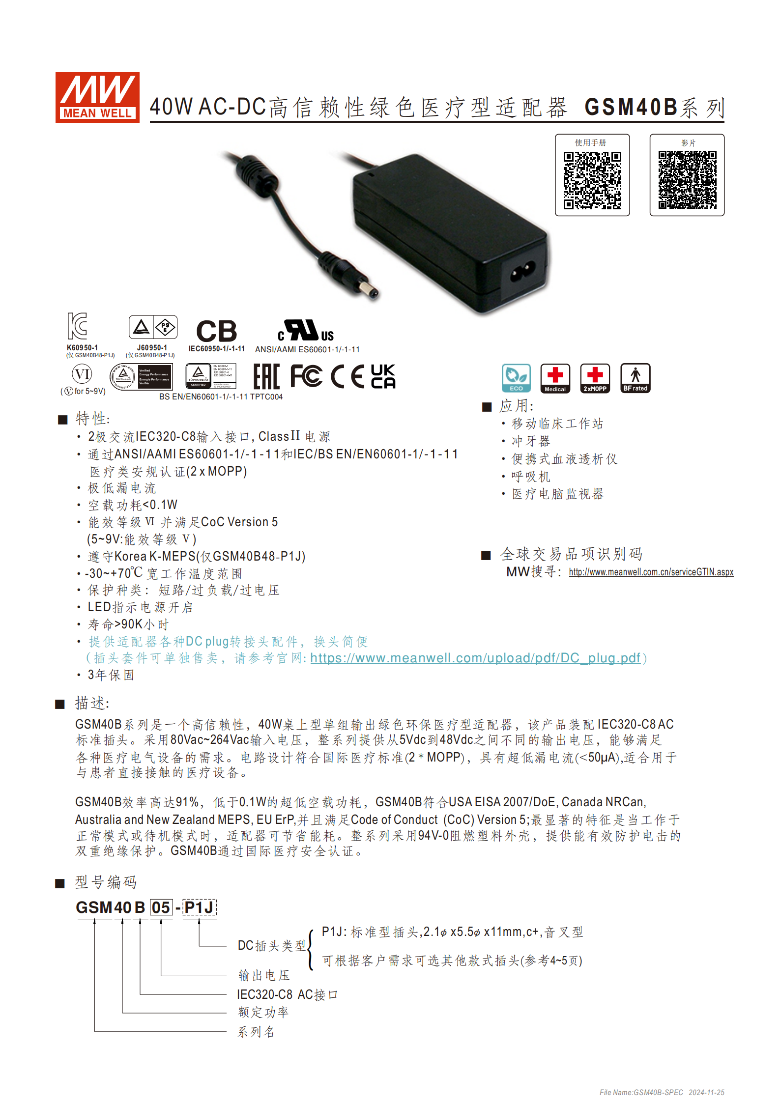 GSM40B 系列是明緯推出的40W AC-DC 高信賴性綠色醫(yī)療型適配器,采用IEC320-C8交流輸入接口,輸入電壓覆蓋 80~264VAC,輸出電壓 5~48Vdc 可選,通過ANSI/AAMI ES60601-1/-1-11、IEC60601-1/-1-11等醫(yī)療安規(guī)認證(2 x MOPP),漏電流 < 50μA,空載功耗 < 0.1W,能效等級達 Ⅵ 級(5~9V 為 Ⅴ 級),工作溫度范圍 **-30~+70℃**,具備短路 / 過負載 / 過電壓三重保護,MTBF 最低達 719.4K 小時,適配移動臨床工作站、呼吸機等醫(yī)療設(shè)備,提供 3 年保固,支持 DC 插頭定制與快速更換,整體采用 94V-0 阻燃塑料外殼實現(xiàn)雙重絕緣防護。