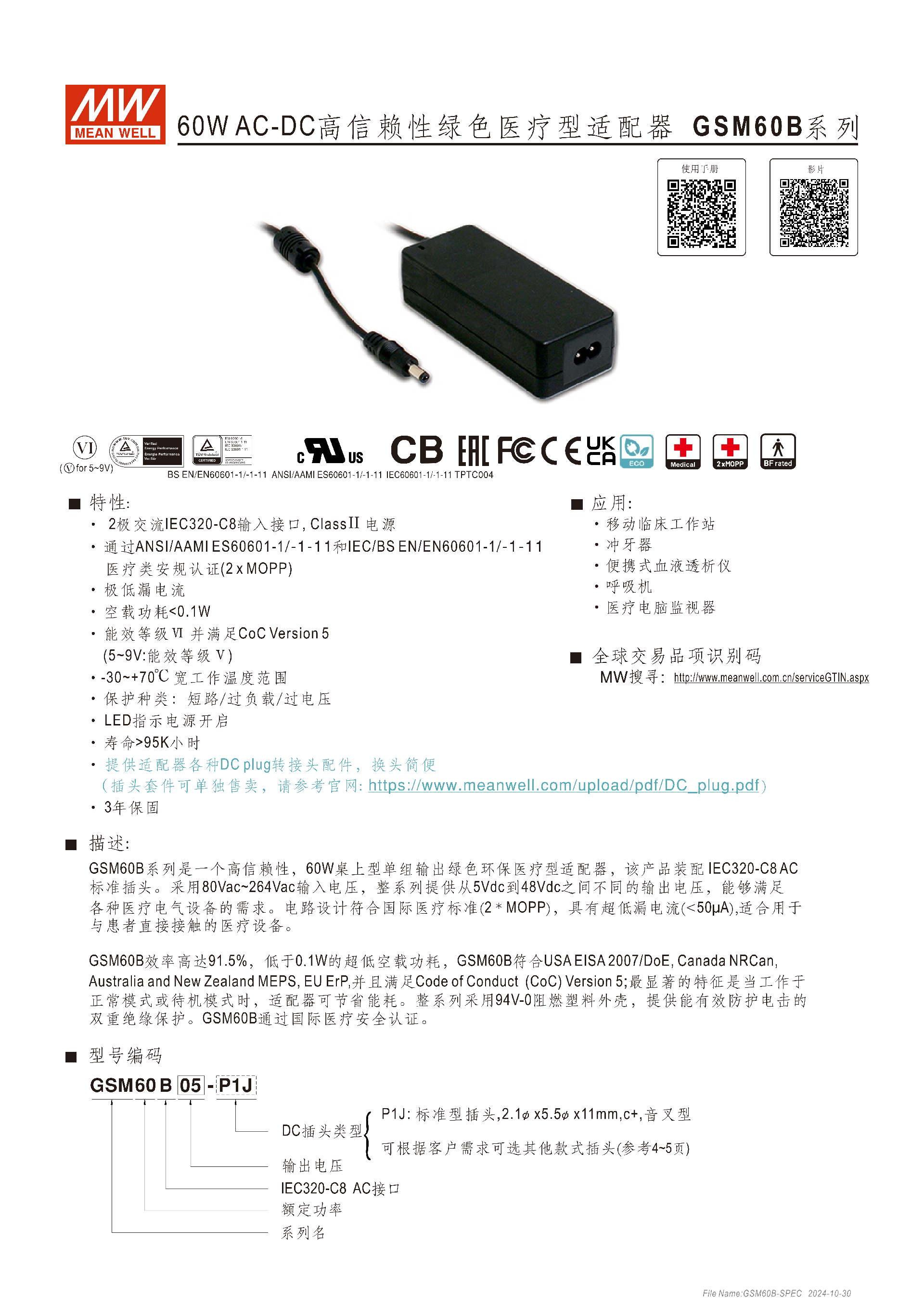 GSM60B 系列是明緯推出的 60W AC-DC 高信賴性綠色醫(yī)療型適配器,為Class Ⅱ 電源,配備 IEC320-C8 交流輸入接口,輸出電壓覆蓋 5Vdc 至 48Vdc,通過ANSI/AAMI ES60601-1/-1-11、IEC/BS EN/EN60601-1/-1-11等醫(yī)療安規(guī)認證且滿足2xMOPP絕緣防護,漏電流 **<50μA**,空載功耗 **<0.1W**,工作溫度范圍 **-30~+70℃,具備短路 / 過負載 / 過電壓等多重保護,壽命超95K 小時 **、提供3 年保固,適配移動臨床工作站、呼吸機等多種醫(yī)療設(shè)備,還支持多種 DC plug 轉(zhuǎn)接頭更換,塑料外殼為94V-0 阻燃雙重絕緣設(shè)計。