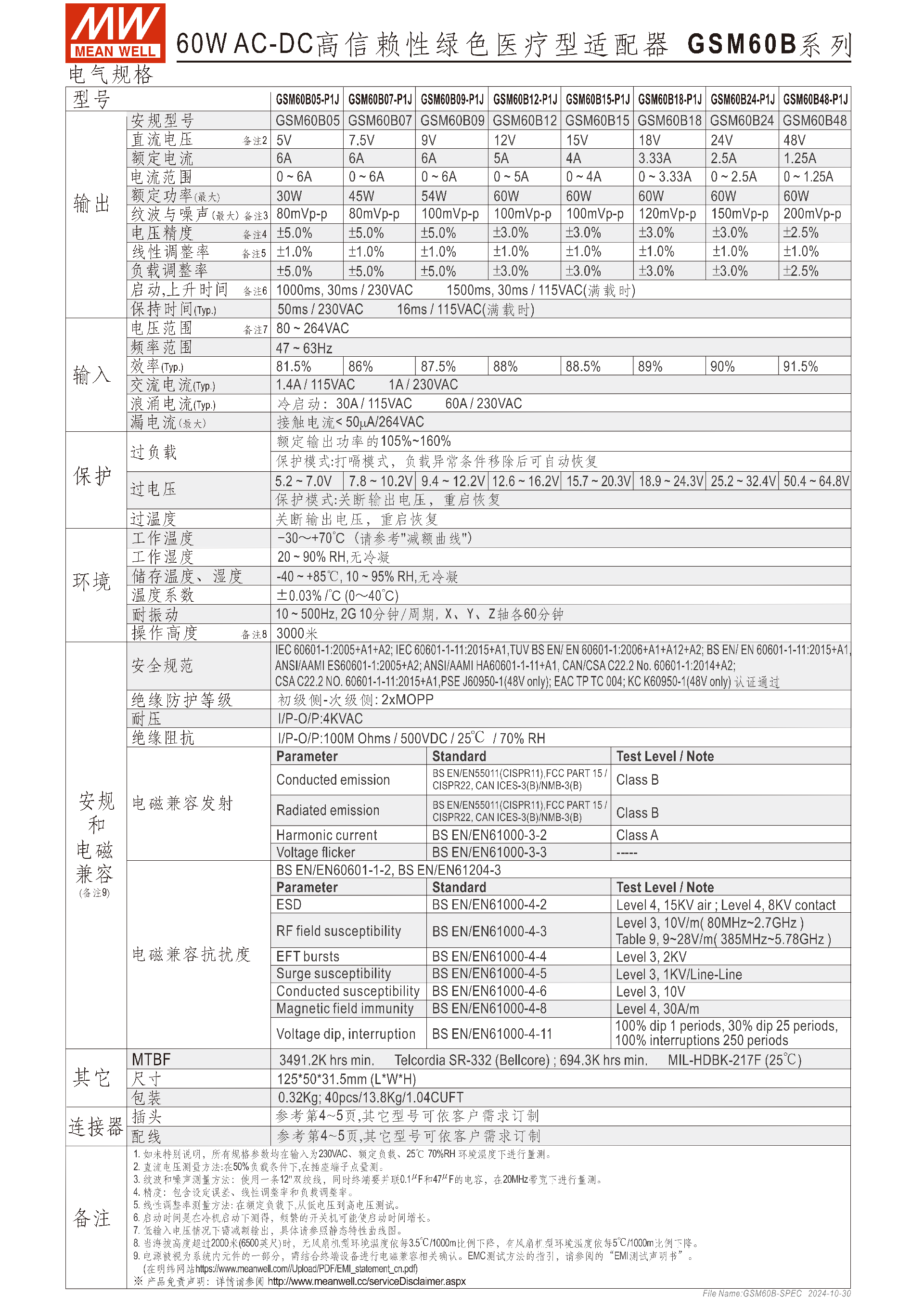 GSM60B 系列是明緯推出的 60W AC-DC 高信賴性綠色醫(yī)療型適配器,為Class Ⅱ 電源,配備 IEC320-C8 交流輸入接口,輸出電壓覆蓋 5Vdc 至 48Vdc,通過(guò)ANSI/AAMI ES60601-1/-1-11、IEC/BS EN/EN60601-1/-1-11等醫(yī)療安規(guī)認(rèn)證且滿足2xMOPP絕緣防護(hù),漏電流 **<50μA**,空載功耗 **<0.1W**,工作溫度范圍 **-30~+70℃,具備短路 / 過(guò)負(fù)載 / 過(guò)電壓等多重保護(hù),壽命超95K 小時(shí) **、提供3 年保固,適配移動(dòng)臨床工作站、呼吸機(jī)等多種醫(yī)療設(shè)備,還支持多種 DC plug 轉(zhuǎn)接頭更換,塑料外殼為94V-0 阻燃雙重絕緣設(shè)計(jì)。
