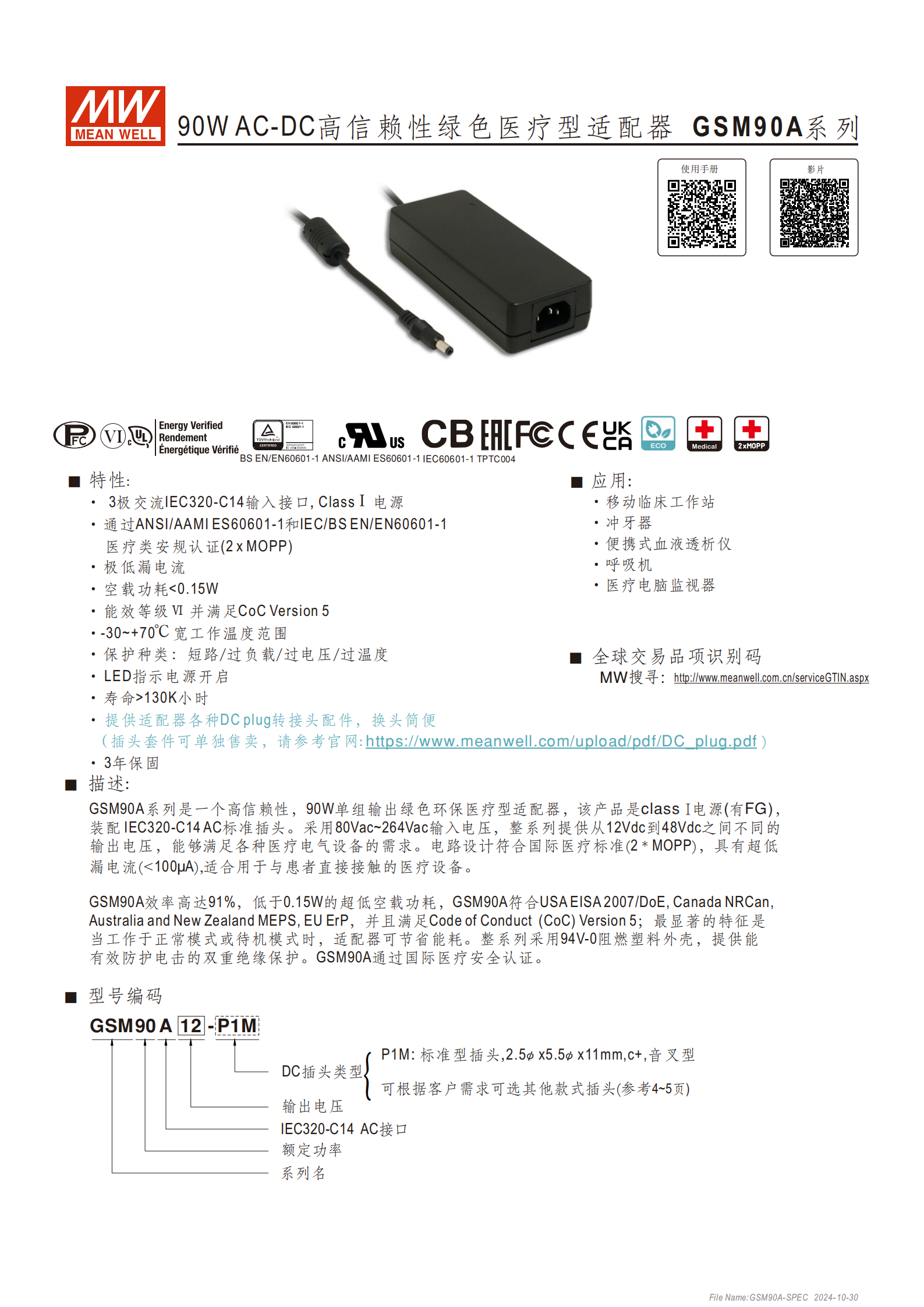 GSM90B 系列是明緯推出的90W AC-DC 高信賴性綠色醫(yī)療型適配器,采用IEC320-C8交流輸入接口、Class Ⅱ 電源設(shè)計(jì),通過ANSI/AAMI ES60601-1/-1-11和IEC/BS EN/EN60601-1/-1-11醫(yī)療安規(guī)認(rèn)證(2 x MOPP),漏電流 **<100μA**,輸入電壓80~264VAC,輸出電壓涵蓋12Vdc-48Vdc,具備 **-30~+70℃寬工作溫度、<0.15W超低空載功耗、91% 高轉(zhuǎn)換效率,擁有短路 / 過負(fù)載 / 過電壓 / 過溫度四重保護(hù),壽命**>90K 小時且提供3 年保固 **,適配移動臨床工作站、呼吸機(jī)等各類醫(yī)療電氣設(shè)備,還支持多種 DC plug 轉(zhuǎn)接頭更換,外殼為94V-0 阻燃**塑料并具備雙重絕緣防護(hù)。