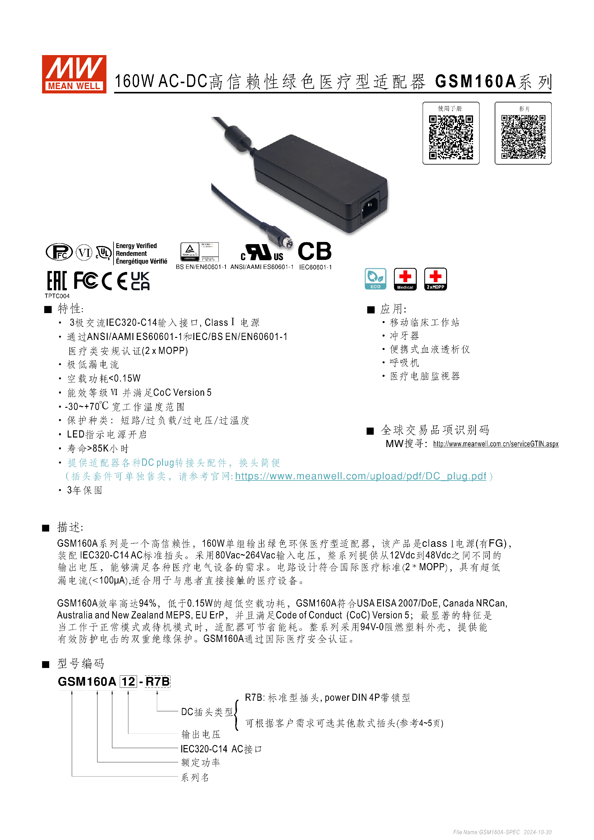 GSM160A 系列是明緯推出的160W AC-DC 高信賴性綠色醫(yī)療型適配器,為 ClassⅠ 電源且配備 3 極交流 IEC320-C14 輸入接口,通過ANSI/AAMI ES60601-1 和 IEC/BS EN/EN60601-1醫(yī)療類安規(guī)認(rèn)證(2 x MOPP),漏電流超低(接觸 < 90μA/264VAC、對(duì)地 < 175μA/264VAC),空載功耗 <**0.15W**,能效達(dá) Ⅵ 級(jí)并滿足 CoC Version 5,工作溫度覆蓋 **-30~+70℃**,提供 12/15/20/24/48Vdc 多檔輸出,具備短路 / 過負(fù)載 / 過電壓 / 過溫度四重保護(hù),MTBF 最低達(dá)**239.4K 小時(shí) **(25℃)、壽命 >85K 小時(shí),標(biāo)配 R7B 插頭且支持多種 DC 轉(zhuǎn)接頭更換,擁有 3 年保固,適用于移動(dòng)臨床工作站、呼吸機(jī)等各類醫(yī)療電氣設(shè)備。