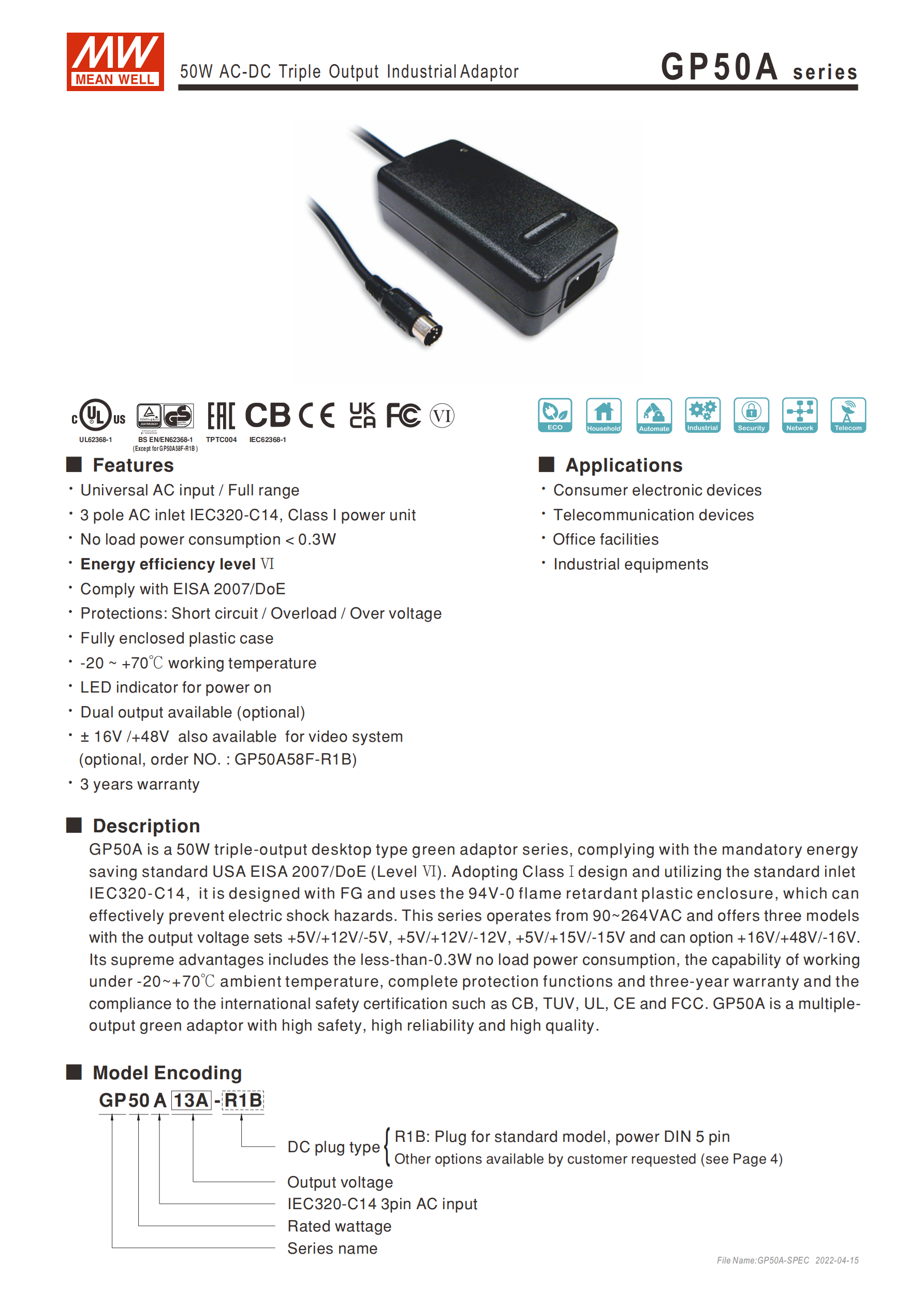 安規(guī)認證:符合 IEC62368-1、UL62368-1、CSA22.2、BS EN/EN62368-1(GP50A58F-R1B 除外)、EAC TP TC 004,通過 CB、TUV、UL、CE、FCC 國際認證;