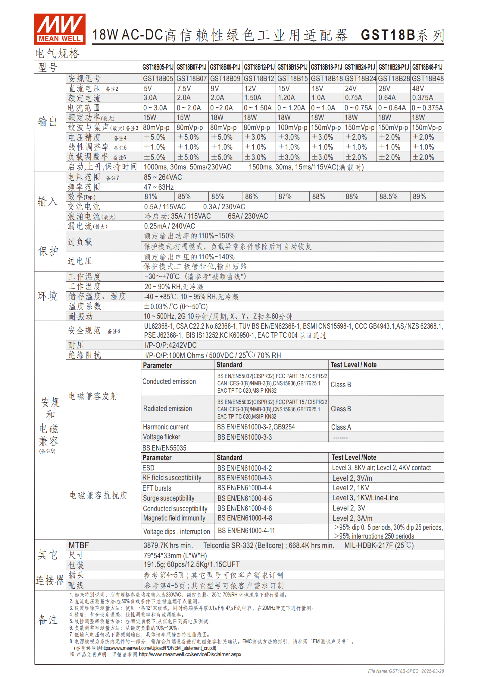 簡化型號:文檔中同時標注了無插頭后綴的簡化型號(如 GST18B05、GST18B07),與帶 - P1J 的完整型號為同一產品,僅標注形式差異,標配均為 P1J 插頭;