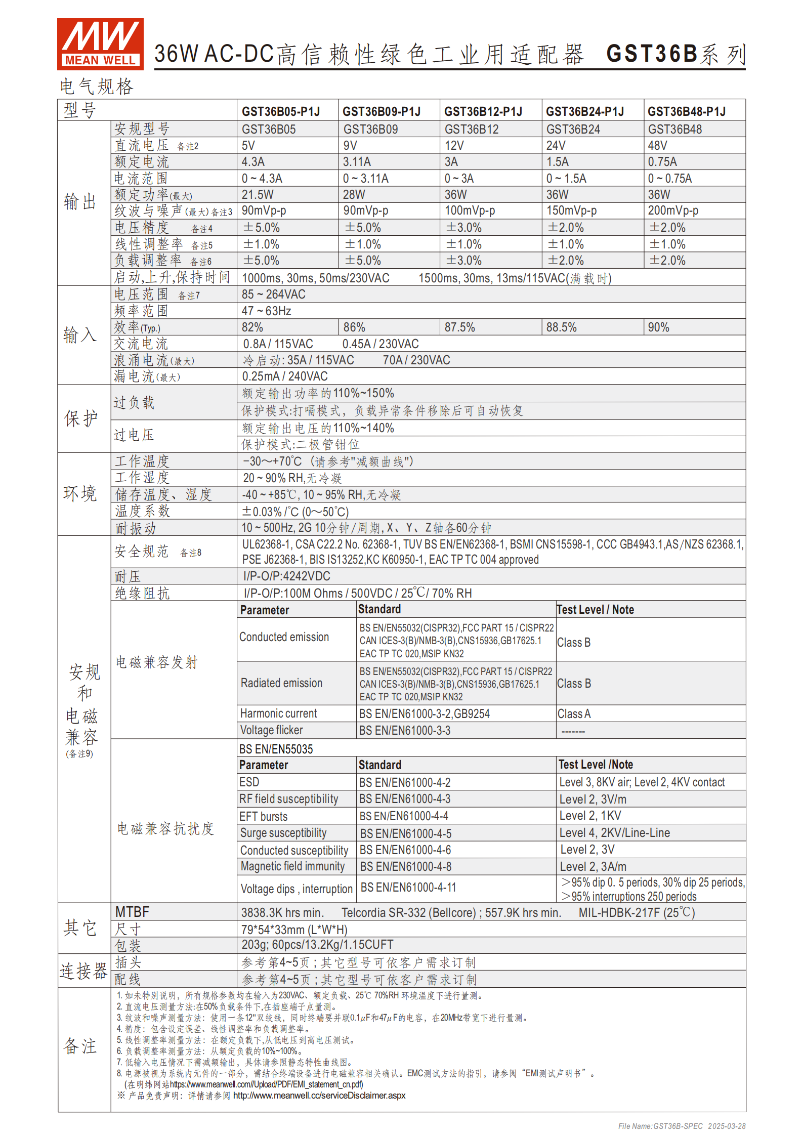 GST36B 系列是明緯研發(fā)的36W 桌上型單組輸出AC-DC 高信賴性綠色環(huán)保適配器,歸屬于Class Ⅱ 電源(無 FG,無保護(hù)接地),通過LPS 限功率電源測試,提供3 年保固服務(wù),插頭套件可單獨(dú)售賣,DC 轉(zhuǎn)接頭支持訂制或選購快速轉(zhuǎn)接頭自行更換。