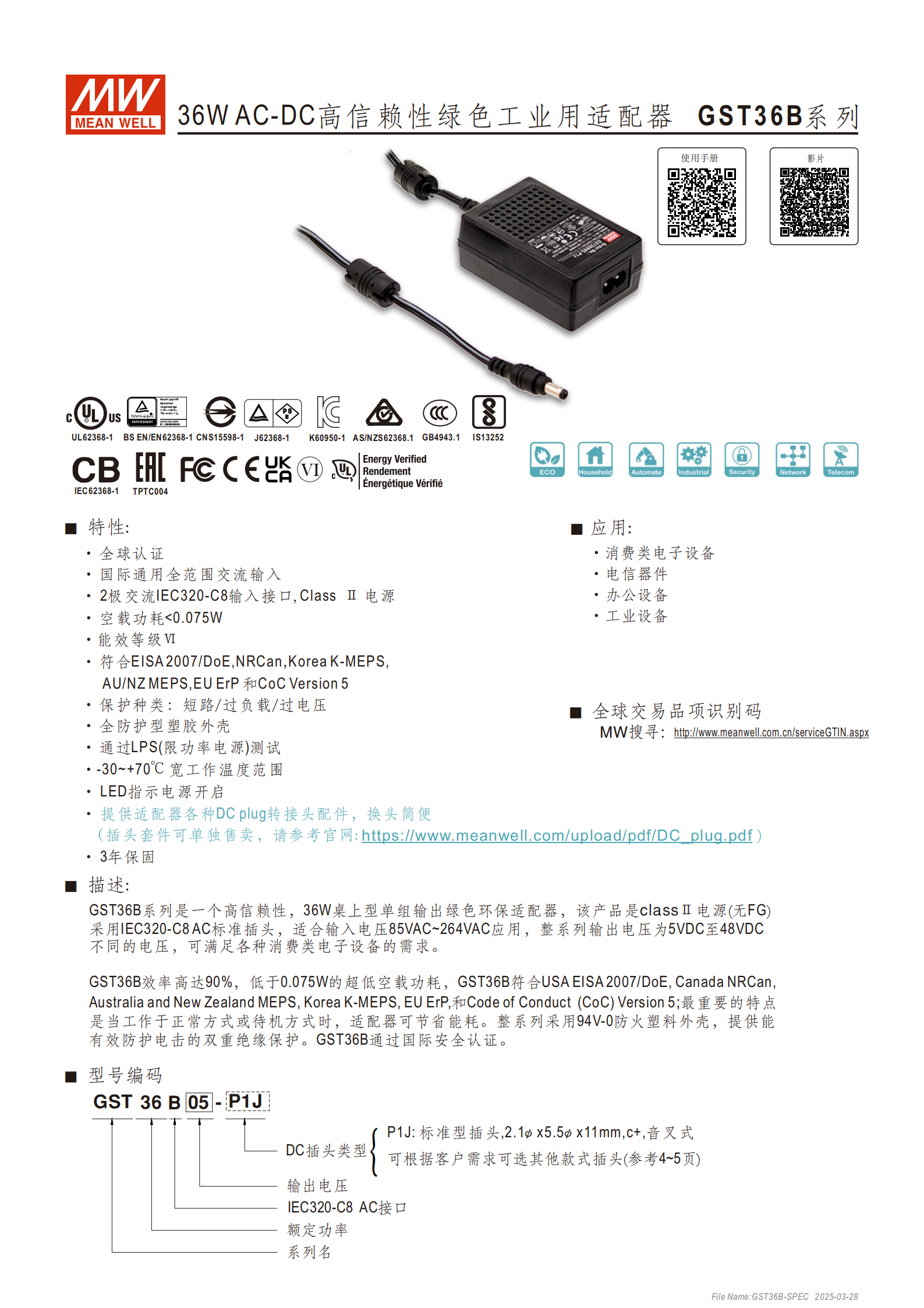 GST40A 系列是明緯推出的40W AC-DC 高信賴性綠色工業(yè)用適配器,為ClassⅠ電源,配備IEC320-C14 3 極交流輸入接口,支持90~264VAC全范圍交流輸入,工作溫度達 **-30~+70℃,空載消耗<0.075W**、最高效率92%,通過全球多項安全與電磁兼容認證,具備短路 / 過負載 / 過電壓全防護,輸出電壓覆蓋5~48VDC多檔位,標配P1J 型 DC 插頭且支持多種轉(zhuǎn)接頭更換,擁有3 年保固,適用于消費電子、電信、辦公及工業(yè)設(shè)備等場景。