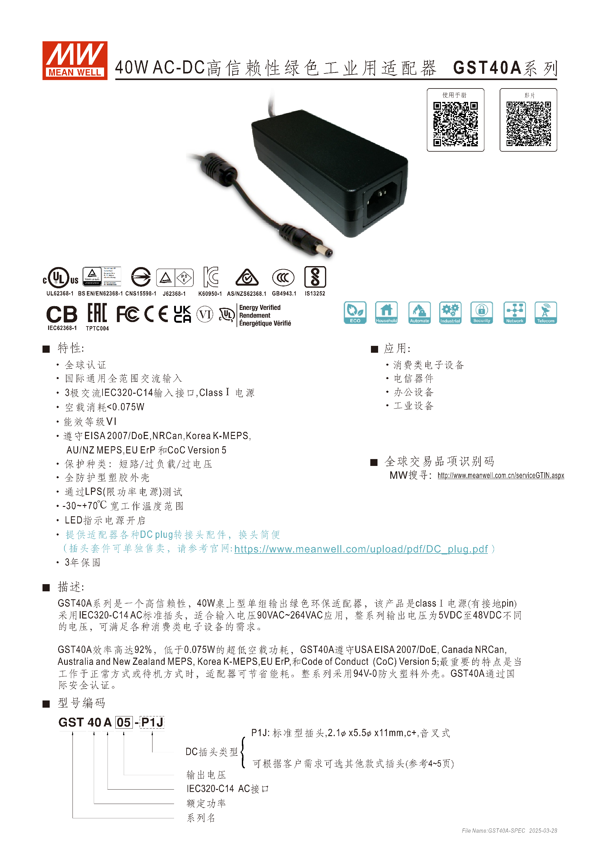 GST40A 系列是明緯推出的40W AC-DC 高信賴性綠色工業(yè)用適配器,為ClassⅠ電源,配備IEC320-C14 3 極交流輸入接口,支持90~264VAC全范圍交流輸入,工作溫度達(dá) **-30~+70℃,空載消耗<0.075W**、最高效率92%,通過(guò)全球多項(xiàng)安全與電磁兼容認(rèn)證,具備短路 / 過(guò)負(fù)載 / 過(guò)電壓全防護(hù),輸出電壓覆蓋5~48VDC多檔位,標(biāo)配P1J 型 DC 插頭且支持多種轉(zhuǎn)接頭更換,擁有3 年保固,適用于消費(fèi)電子、電信、辦公及工業(yè)設(shè)備等場(chǎng)景。