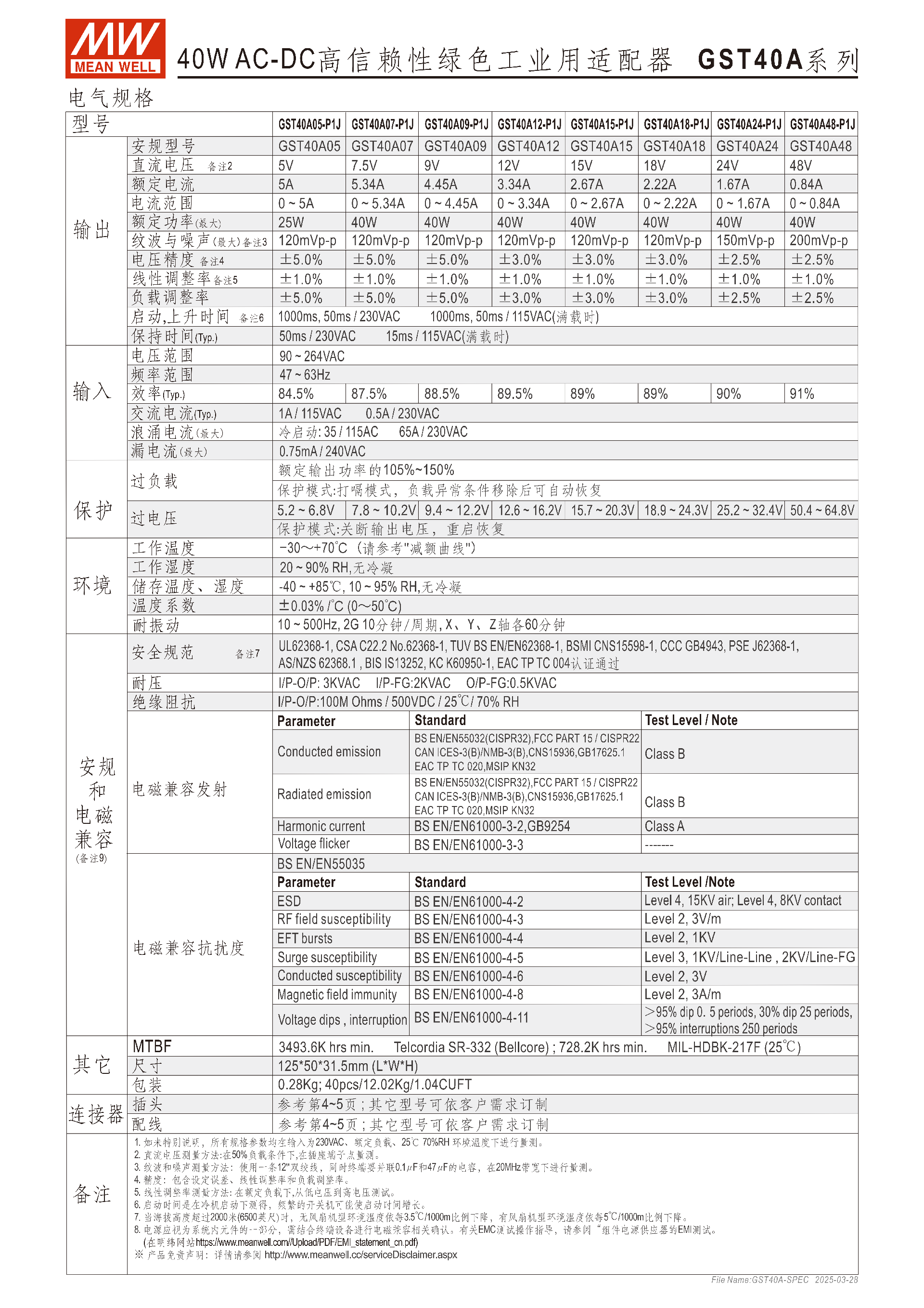 | GST40A07-P1J | 7.5VDC | 5.34A | 40W | 120mVp-p | ±5.0% | 87.5% |