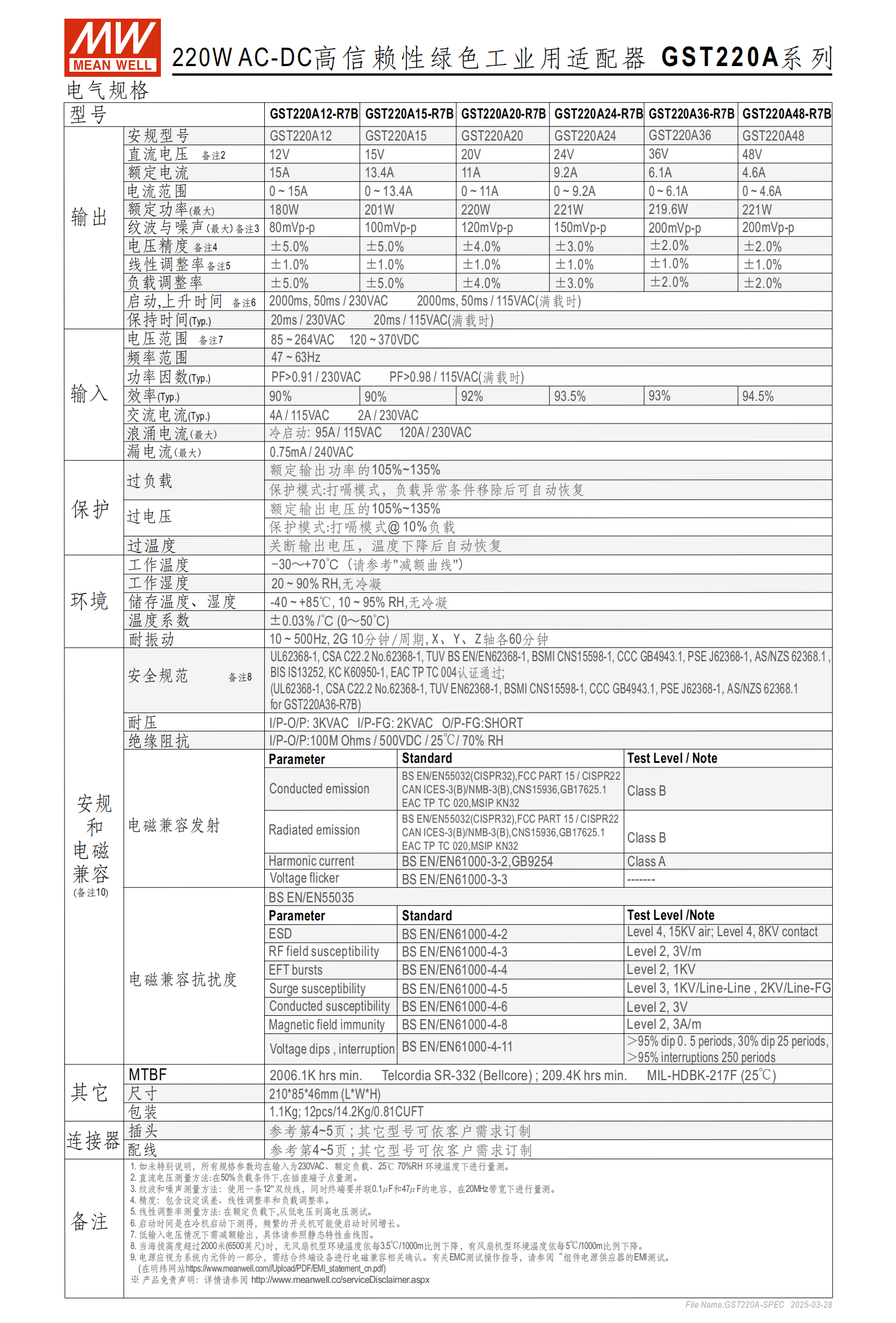 | GST220A48-R7E | 48VDC | 4.6A | 221W | 200mVp-p | ±2.0% | 93.5% |