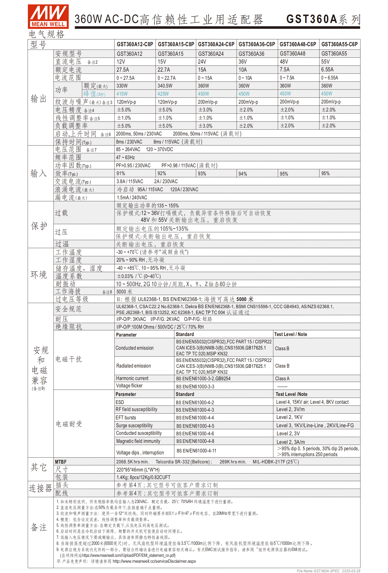 GST360A 系列為分電壓段設(shè)計,不同輸出電壓對應(yīng)專屬型號,且均有帶插頭后綴(如 - C8P/C6P)的標準款,核心型號及關(guān)鍵電氣參數(shù)如下表,所有型號峰值功率均可持續(xù) 3 秒,交流輸入均為 85VAC~264VAC、頻率 47~63Hz: