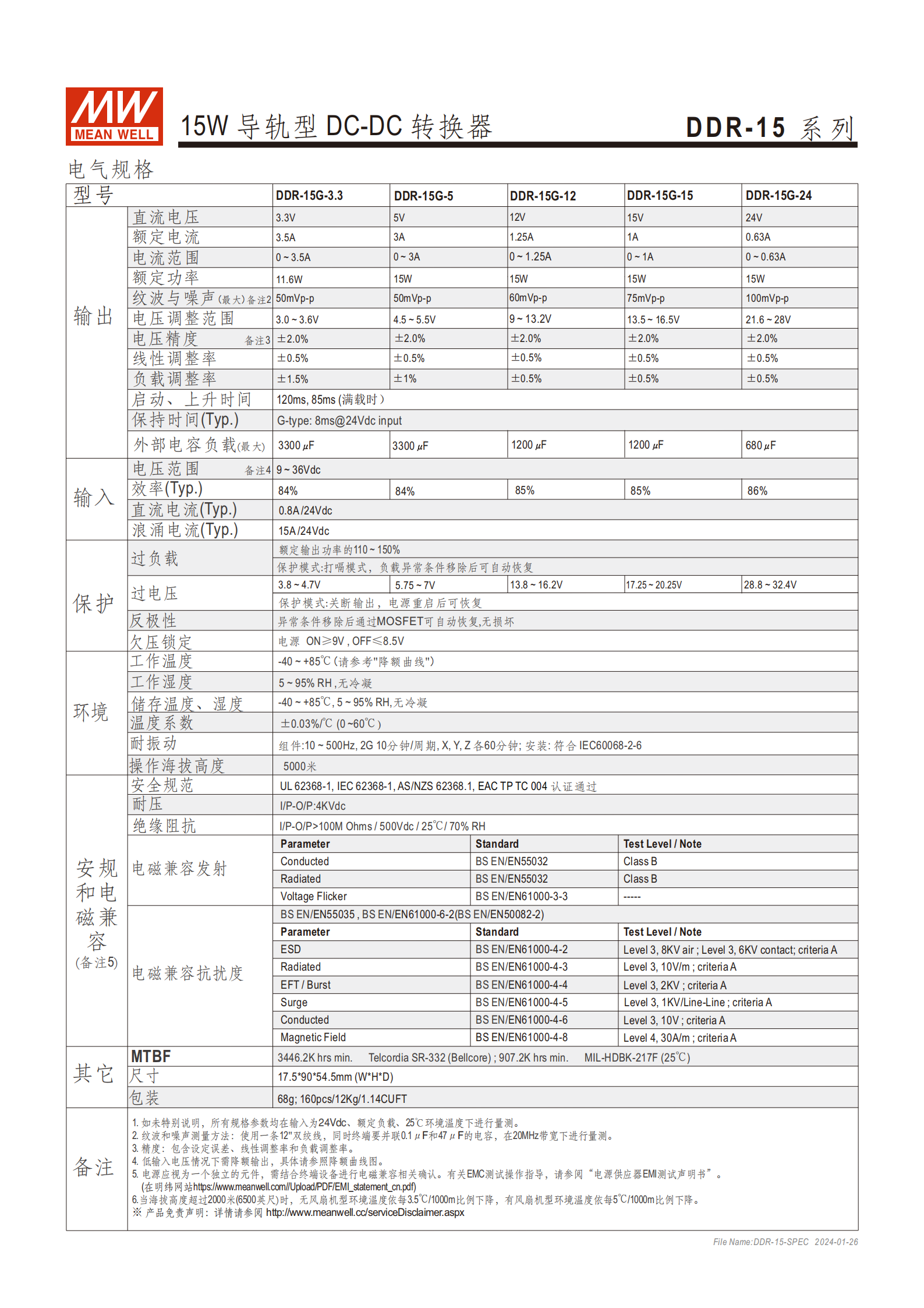 明緯 DDR-15 系列是 15W 超薄導軌型 DC-DC 轉換器,寬度僅17.5mm,分DDR-15G(9~36Vdc 輸入)和DDR-15L(18~75Vdc 輸入)兩大款型,均提供 3.3V/5V/12V/15V/24V 多種輸出,具備4:1 超寬輸入范圍、-40~+85℃寬工作溫度、4KVdc 輸入輸出增強隔離、±10% 輸出電壓可調特性,無最小負載要求,擁有短路 / 過負載等全維度保護功能,支持 TS-35/7.5 或 15 導軌安裝、自然風冷,通過 UL62368-1 等多項安規(guī)認證,MTBF 值最高達3446.2K hrs,質保 3 年,適用于工業(yè)控制、通信系統(tǒng)等多領域。