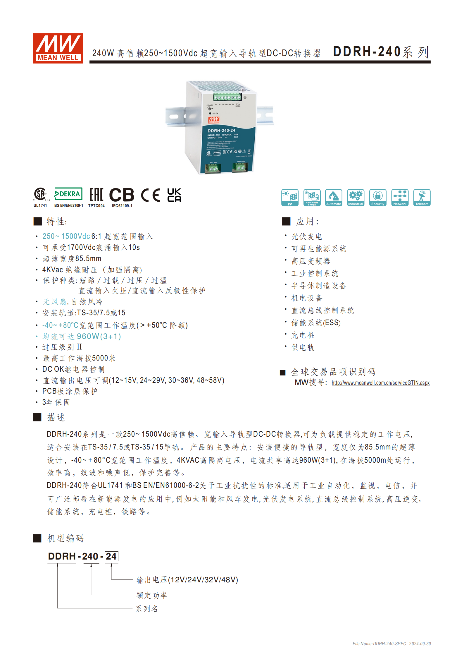 DDRH-240 系列是明緯推出的240W超寬輸入導軌型 DC-DC 轉換器,輸入電壓覆蓋250~1500Vdc且可承受1700Vdc浪涌輸入 10s,擁有85.5mm超薄寬度,支持 TS-35/7.5/15 導軌安裝,工作溫度為 **-40~+80℃、最高工作海拔5000 米 **,具備4KVac加強隔離耐壓,輸出有 12/24/32/48V 四種規(guī)格且電壓可調,支持3+1均流至960W,配備短路、過載等完善的保護功能,自然風冷無風扇設計,通過 UL1741 等多項認證,適用于光伏發(fā)電、儲能系統(tǒng)、充電樁等新能源及工業(yè)控制領域,提供3 年保固。
