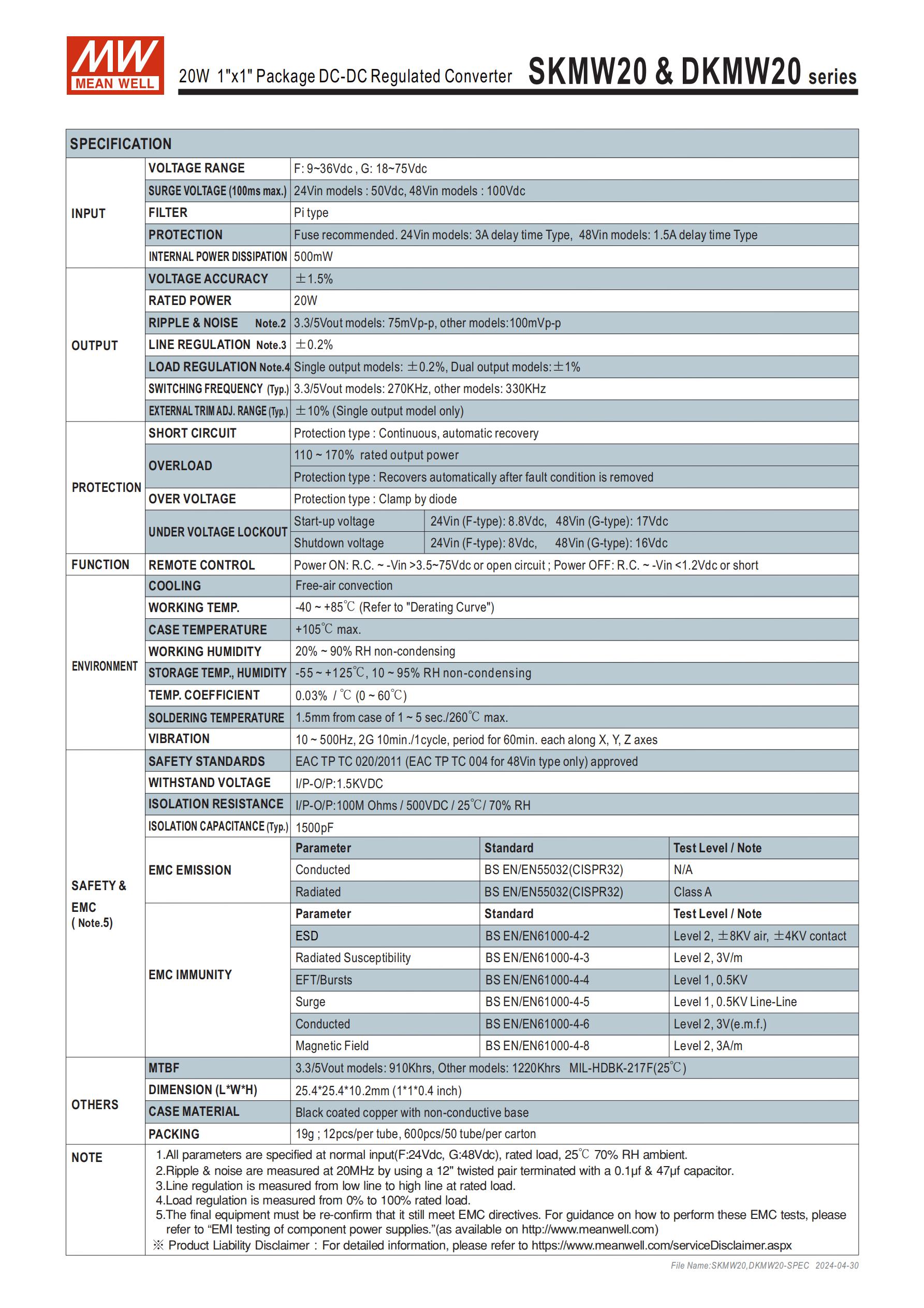 SKMW20/DKMW20 系列是明緯推出的20W、1"x1" DIP 封裝隔離穩(wěn)壓 DC-DC 轉(zhuǎn)換器,分單組(S)/ 雙組(D)輸出,具備4:1 超寬輸入范圍(F 型 9~36Vdc、G 型 18~75Vdc)、1.5KVDC 輸入輸出隔離、-40~+85℃寬工作溫度等特性,效率最高達(dá)89%,支持 **±10% 輸出電壓微調(diào)和遙控開 / 關(guān) **,擁有短路、過載等多重自動(dòng)恢復(fù)保護(hù),符合BS EN/EN55032 輻射 A 級標(biāo)準(zhǔn),無需額外組件,適配電信、工業(yè)控制、儀器等領(lǐng)域,提供3 年保固,MTBF 最高達(dá)1220Khrs。
