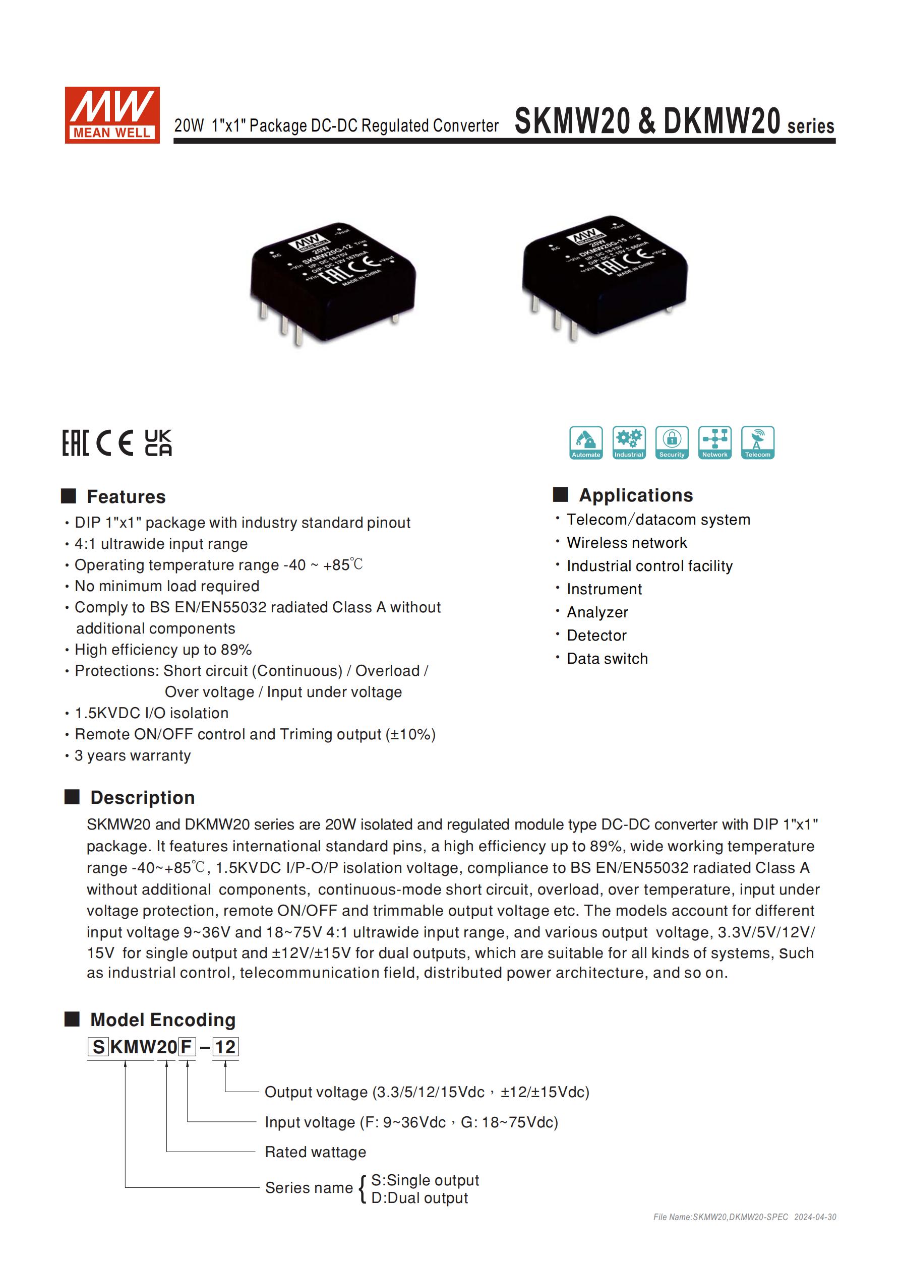 SKMW20/DKMW20 系列是明緯生產(chǎn)的20W隔離穩(wěn)壓型 DC-DC 轉換器,采用1"x1" DIP 封裝并配備行業(yè)標準引腳,為全球交易品項,分SKMW20(單組輸出)和DKMW20(雙組輸出)兩大類型,適用于分布式電源架構,廣泛應用于電信 / 數(shù)據(jù)通信、工業(yè)控制、儀器儀表等領域,提供3 年保固。