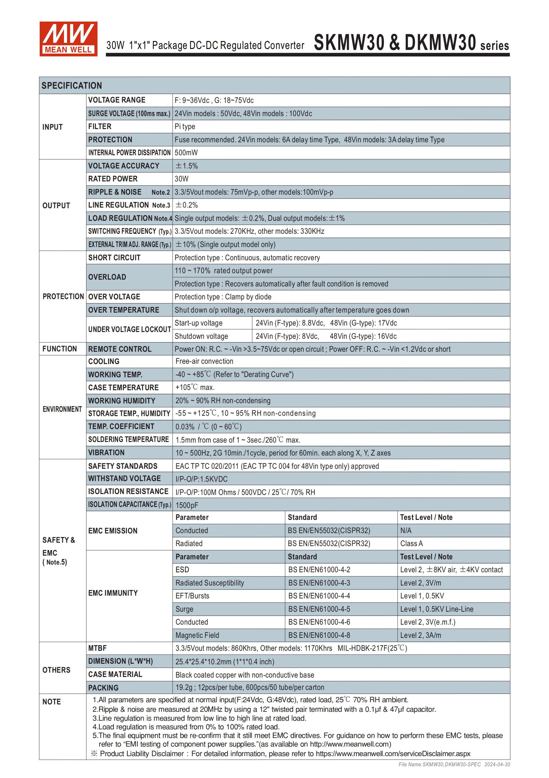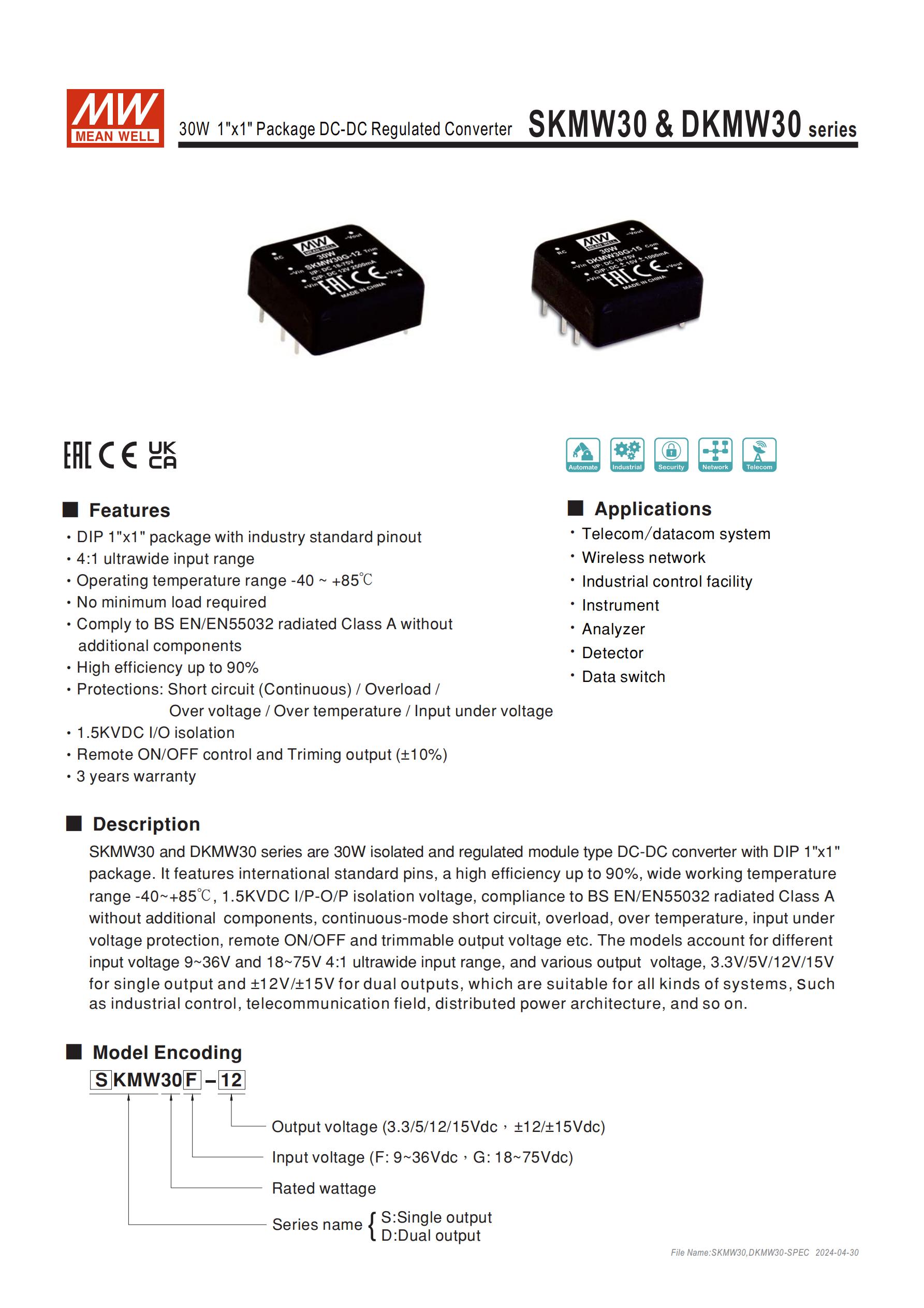 SKMW30/DKMW30 系列是明緯推出的30W、1"x1" DIP 封裝的隔離穩(wěn)壓 DC-DC 轉(zhuǎn)換器,分單組(S)/ 雙組(D)輸出類型,具備4:1 超寬輸入范圍(F 型 9~36Vdc、G 型 18~75Vdc)、1.5KVDC 輸入輸出隔離、-40~+85℃寬工作溫度等核心特性,效率最高達(dá)90%,擁有短路 / 過(guò)載 / 過(guò)壓等多重自動(dòng)恢復(fù)保護(hù),支持 **±10% 輸出電壓微調(diào)和遙控開(kāi) / 關(guān),符合 BS EN/EN55032 輻射 A 級(jí)標(biāo)準(zhǔn),無(wú)需額外組件,適用于電信、工業(yè)控制、儀器等領(lǐng)域,提供3 年保固 **,封裝尺寸為25.425.410.2mm。