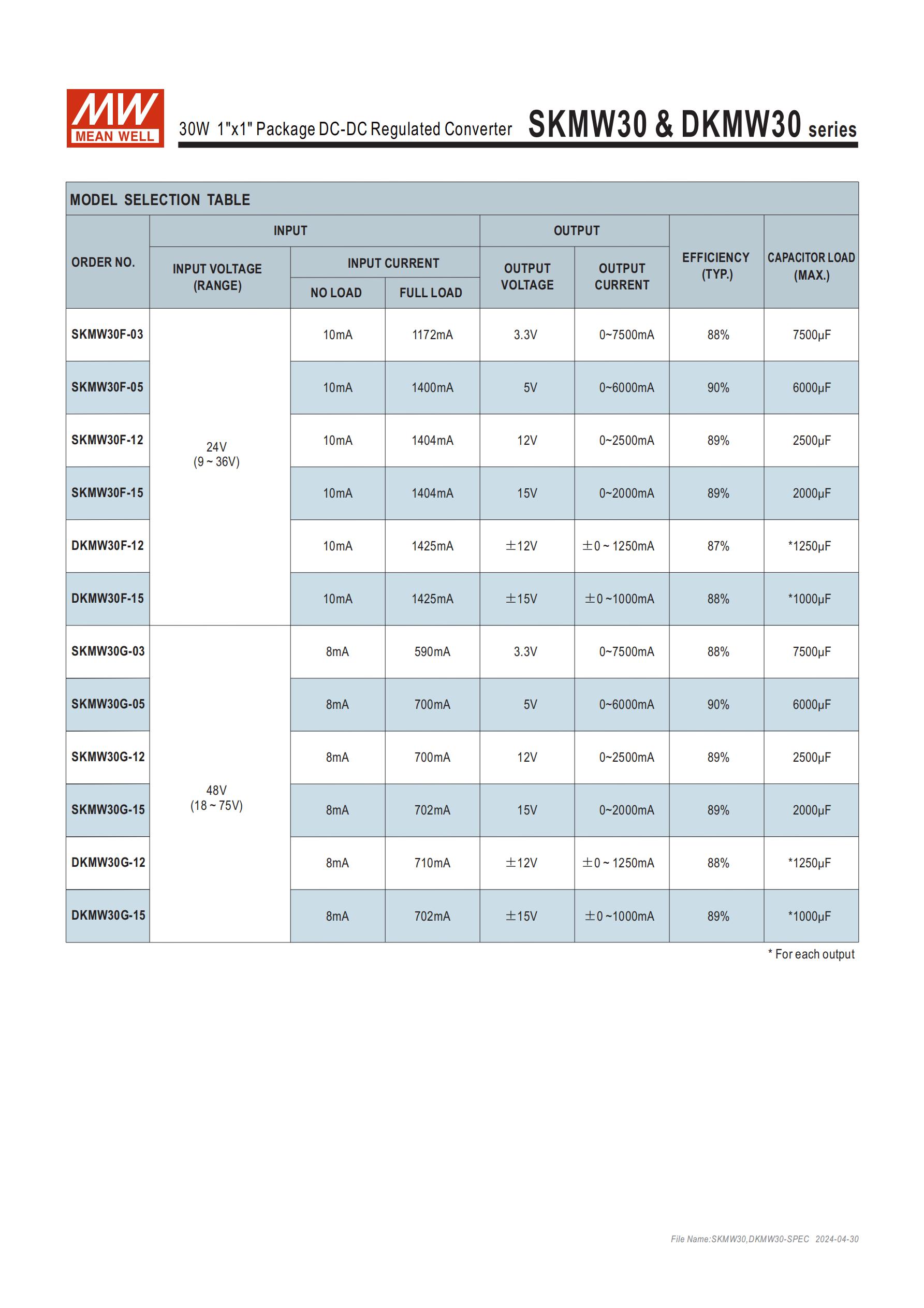 | SKMW30F-03 | 9~36Vdc | 3.3V | 10mA | 1172mA | 0~7500mA | 88% | 7500μF |