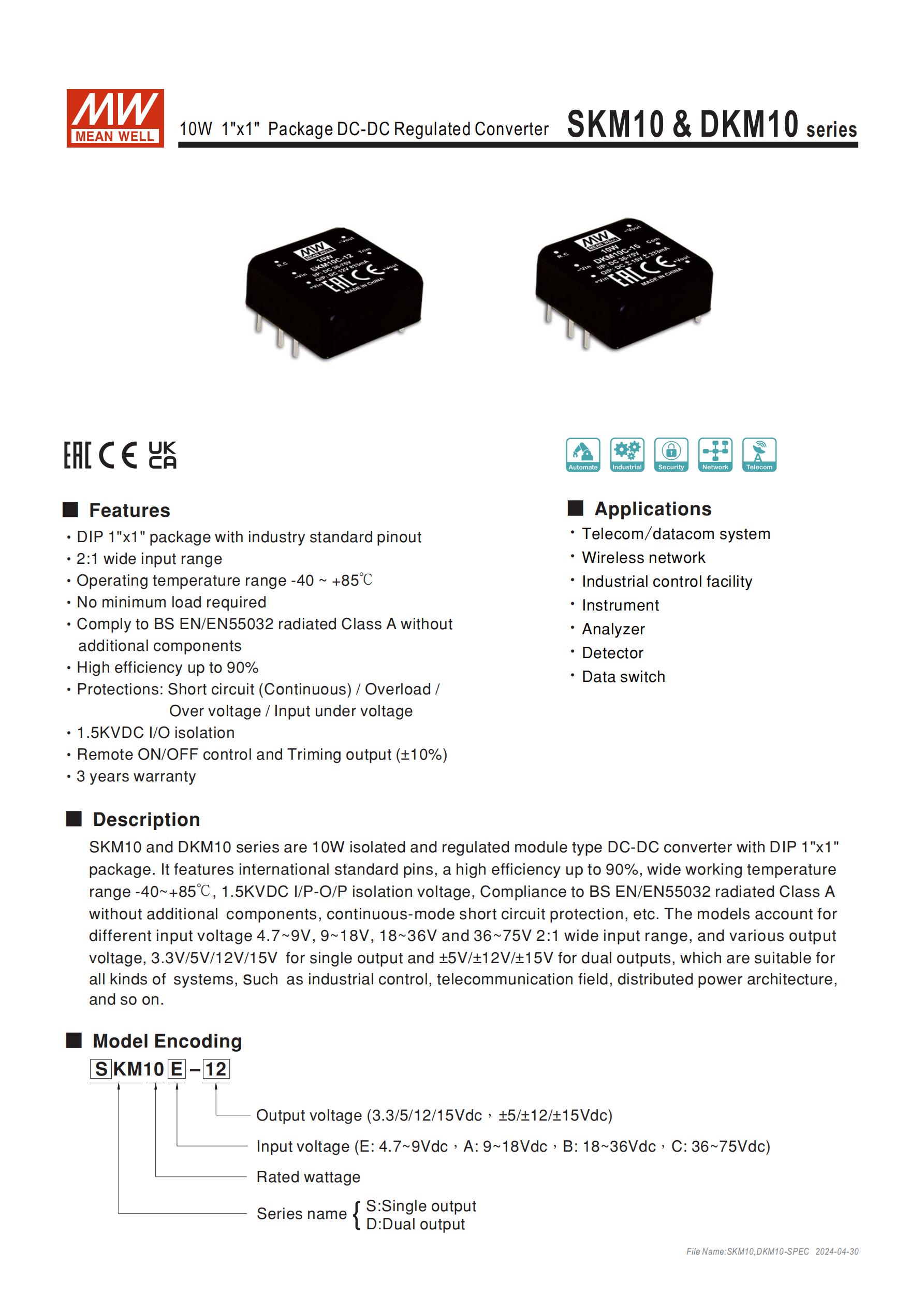 SKM10&DKM10 系列是明緯推出的10W 1"x1" DIP 封裝DC-DC 穩(wěn)壓轉(zhuǎn)換器,擁有2:1 寬輸入范圍(4.7~9V/9~18V/18~36V/36~75V)、1.5KVDC 輸入輸出隔離,工作溫度覆蓋 **-40~+85℃,效率最高達(dá)90%,支持單 / 雙組輸出且輸出電壓可±10% 微調(diào) **,具備短路 / 過(guò)負(fù)載 / 過(guò)電壓 / 欠壓輸入等多重保護(hù),無(wú)需最小負(fù)載且符合 BS EN/EN55032 輻射 A 級(jí)標(biāo)準(zhǔn),適用于電信、工業(yè)控制、儀器等領(lǐng)域,提供3 年保固,MTBF 達(dá)1200Khrs(25℃)。