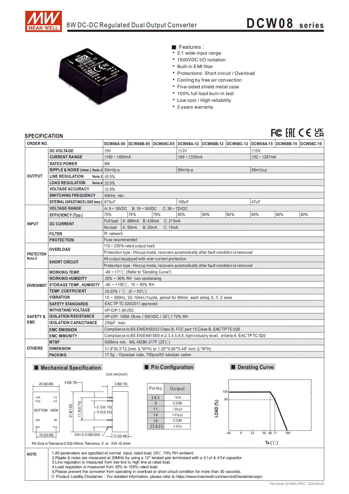 DCW08 系列是 8W DC-DC 穩(wěn)壓雙組輸出轉(zhuǎn)換器,具備2:1 寬范圍輸入、1500VDC 輸入 / 輸出隔離特性,內(nèi)建 EMI 濾波電路,支持短路 / 過負(fù)載打嗝模式保護(hù)且可自動恢復(fù),采用五面防護(hù)金屬外殼、自然冷卻設(shè)計,經(jīng) 100% 滿載老化,擁有 2 年保固;該系列分 A/B/C 三類輸入電壓(9~18VDC/18~36VDC/36~72VDC),輸出 ±5V/±12V/±15V 三種規(guī)格,額定功率 8W,工作溫度 **-40~+71°C**,尺寸為31.820.312.2mm,安規(guī)與電磁兼容符合多項標(biāo)準(zhǔn),MTBF≥900Khrs,包裝為 15 顆 / 管、750 顆 / 箱。