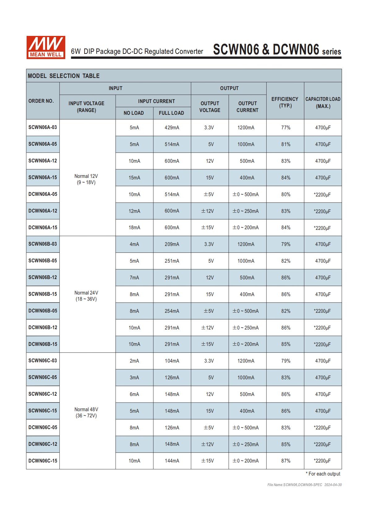 該系列分單組輸出(SCWN06)和雙組輸出(DCWN06)兩大類型,輸入分 A/B/C 三檔,各機型核心參數(shù)如下表,電容負載單組輸出最大為4700μF,雙組輸出每路最大為2200μF:
