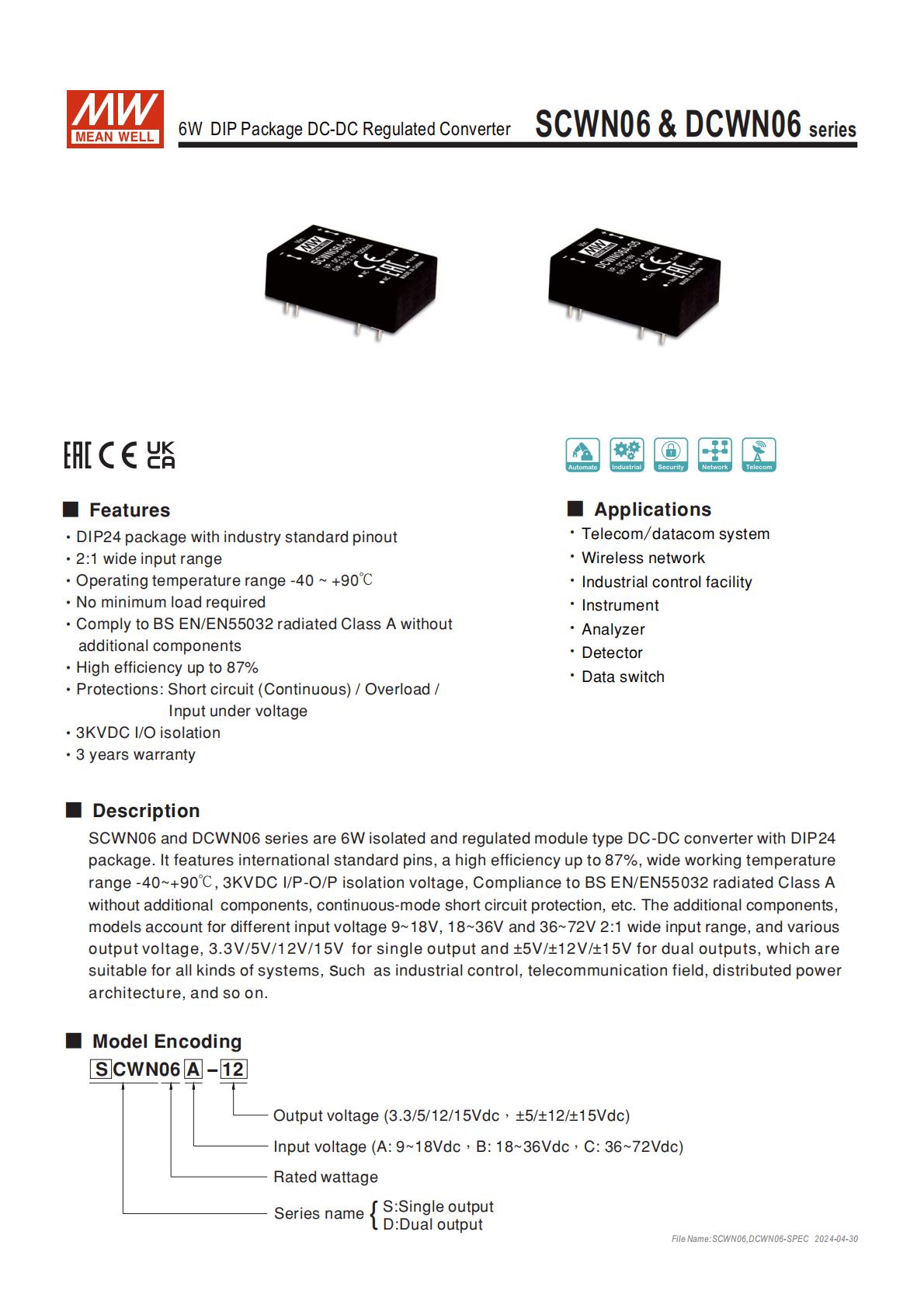 SCWN06&DCWN06 系列是明緯推出的6W DIP24 封裝隔離型 DC-DC 穩(wěn)壓轉(zhuǎn)換器,具備2:1 寬輸入范圍(9~18V/18~36V/36~72V)、3KVDC 輸入輸出隔離、-40~+90℃寬工作溫度,效率最高達87%,支持單 / 雙組輸出(3.3V/5V/12V/15V/±5V/±12V/±15V),擁有短路 / 過負載 / 輸入欠壓全保護且無需最小負載,符合BS EN/EN55032 輻射 A 級,適用于電信、工業(yè)控制等領(lǐng)域,提供3 年保固,模塊尺寸為31.820.310.2mm,采用自然風冷散熱。