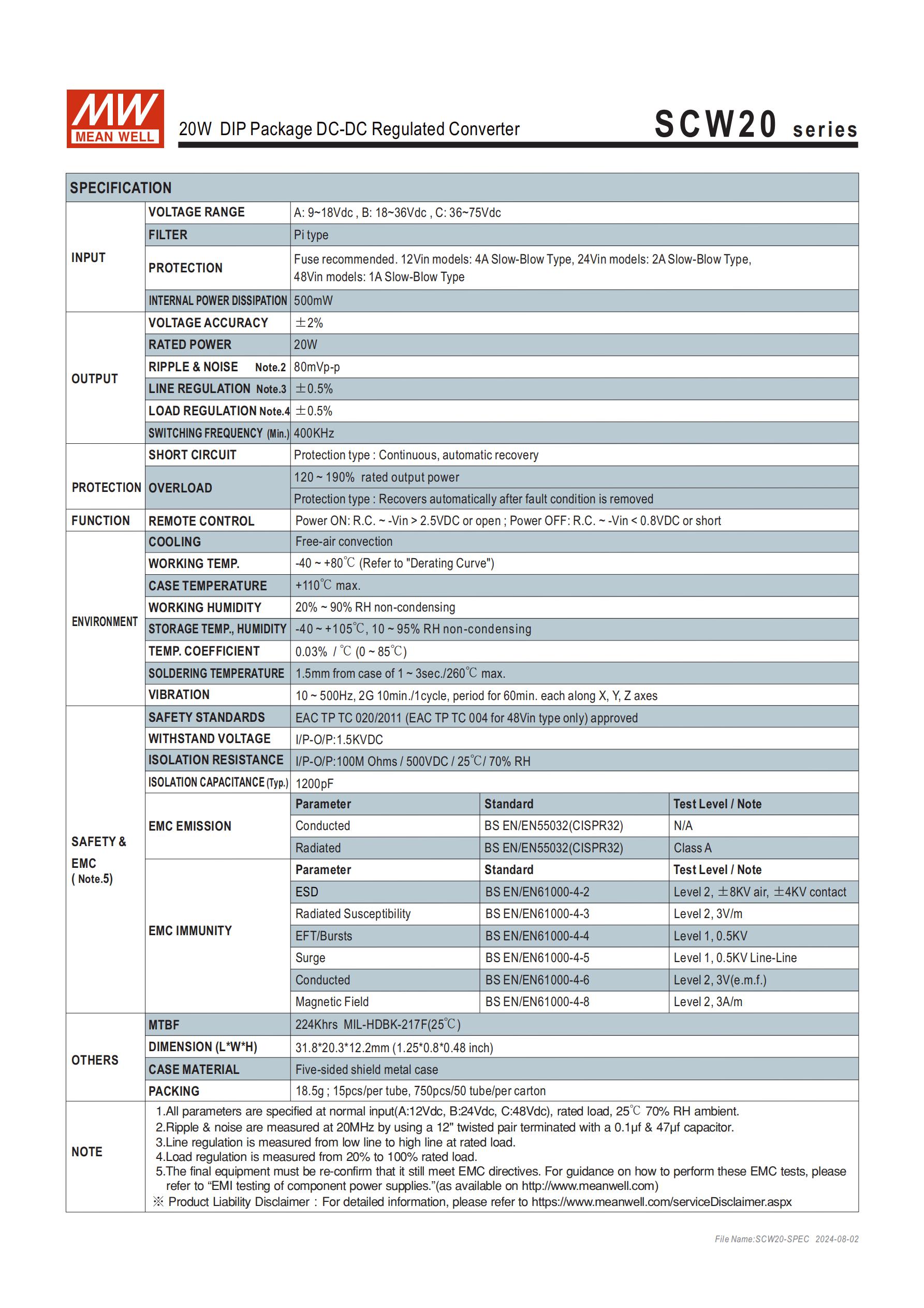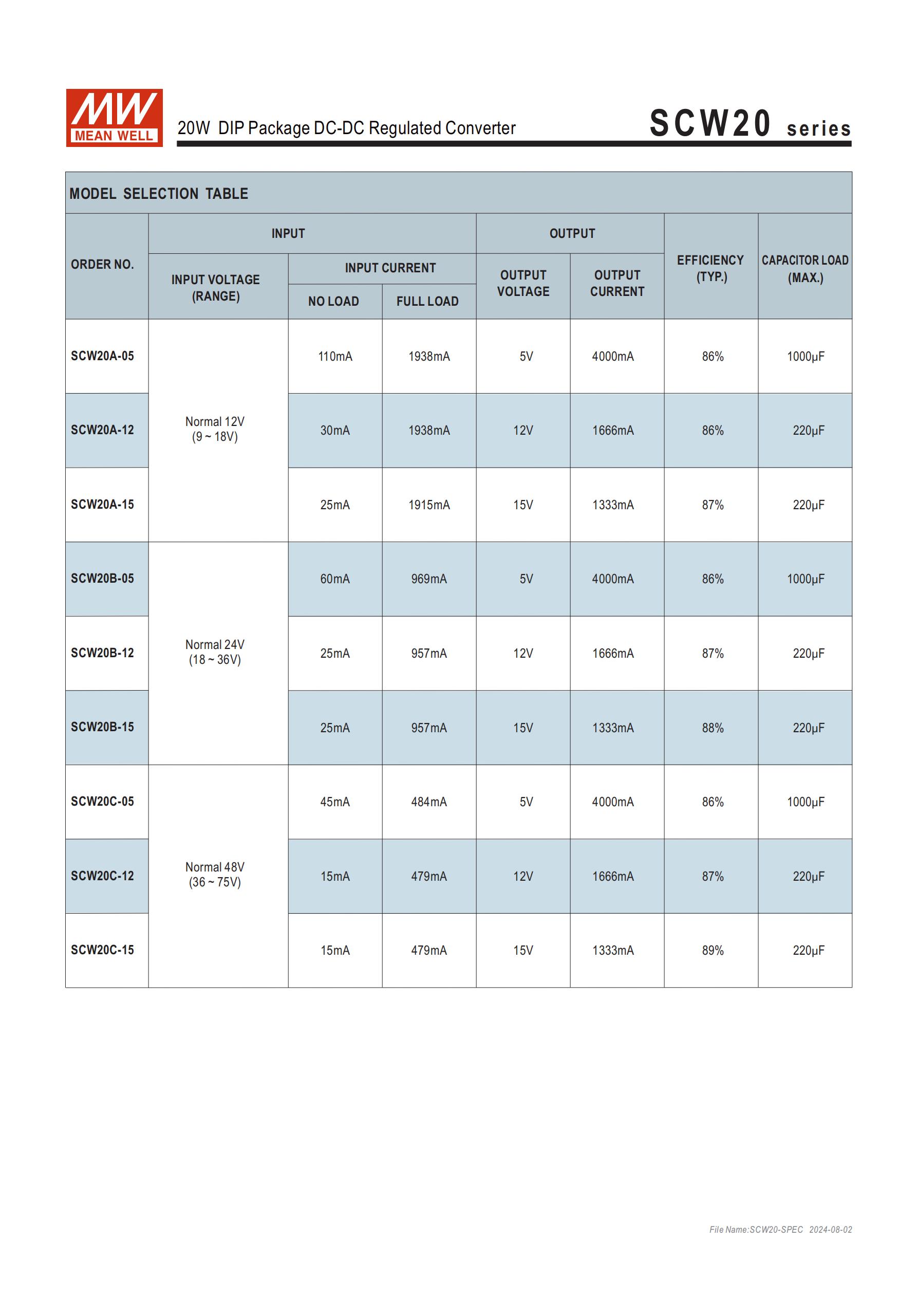 SCW20+輸入檔+輸出電壓,輸入檔 A=9~18Vdc、B=18~36Vdc、C=36~75Vdc;輸出電壓為 5/12/15Vdc,額定功率 20W。核心機型參數(shù)表| 訂單號 | 輸入電壓范圍 | 空載輸入電流 | 滿載輸入電流 | 輸出電壓 | 輸出電流 | 典型效率 | 最大電容負載 ||--------|--------------|--------------|--------------|----------|----------|----------|--------------|| SCW20A-05 | 9~18V | 110mA | 1938mA | 5V | 4000mA | 86% | 1000μF || SCW20A-12 | 9~18V | 30mA | 1938mA | 12V | 1666mA | 86% | 220μF || SCW20A-15 | 9~18V | 25mA | 1915mA | 15V | 1333mA | 87% | 220μF || SCW20B-05 | 18~36V | 60mA | 969mA | 5V | 4000mA | 86% | 1000μF || SCW20B-12 | 18~36V | 25mA | 957mA | 12V | 1666mA | 87% | 220μF || SCW20B-15 | 18~36V | 25mA | 957mA | 15V | 1333mA | 88% | 220μF || SCW20C-05 | 36~75V | 45mA | 484mA | 5V | 4000mA | 86% | 1000μF || SCW20C-12 | 36~75V | 15mA | 479mA | 12V | 1666mA | 87% | 220μF || SCW20C-15 | 36~75V | 15mA | 479mA | 15V | 1333mA | 89% | 220μF |