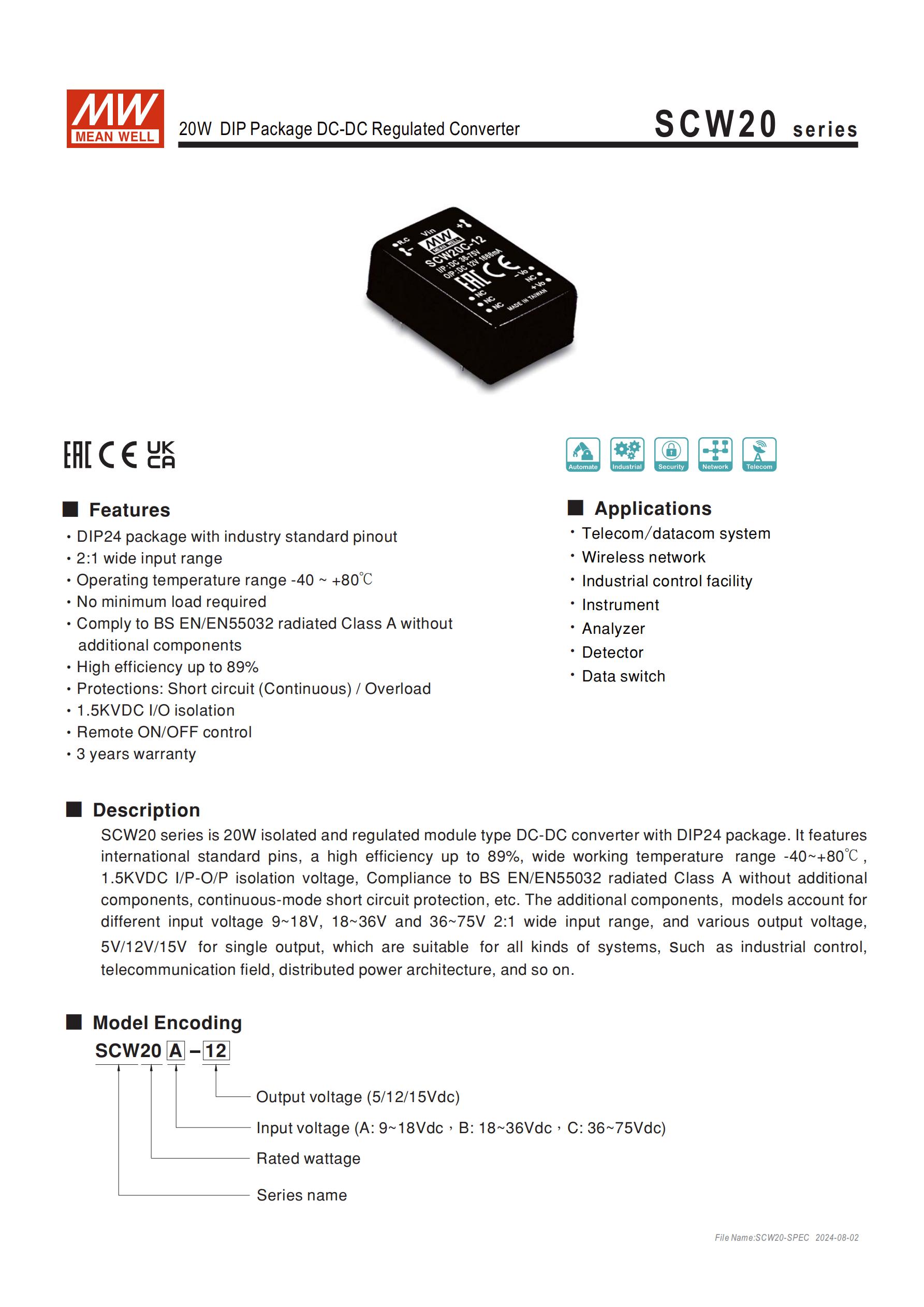SCW20 系列為明緯研發(fā)的20W DIP24 封裝隔離式穩(wěn)壓 DC-DC 轉(zhuǎn)換器,采用行業(yè)標準引腳、五面金屬外殼設計,主打?qū)捿斎敕秶?、高可靠性與強兼容性,無需最小負載且無需額外組件即可滿足電磁兼容 A 級標準,適用于工業(yè)、通信等多領域分布式電源架構(gòu),提供3 年保固,MTBF 達224Khrs(MIL-HDBK-217F,25℃)。