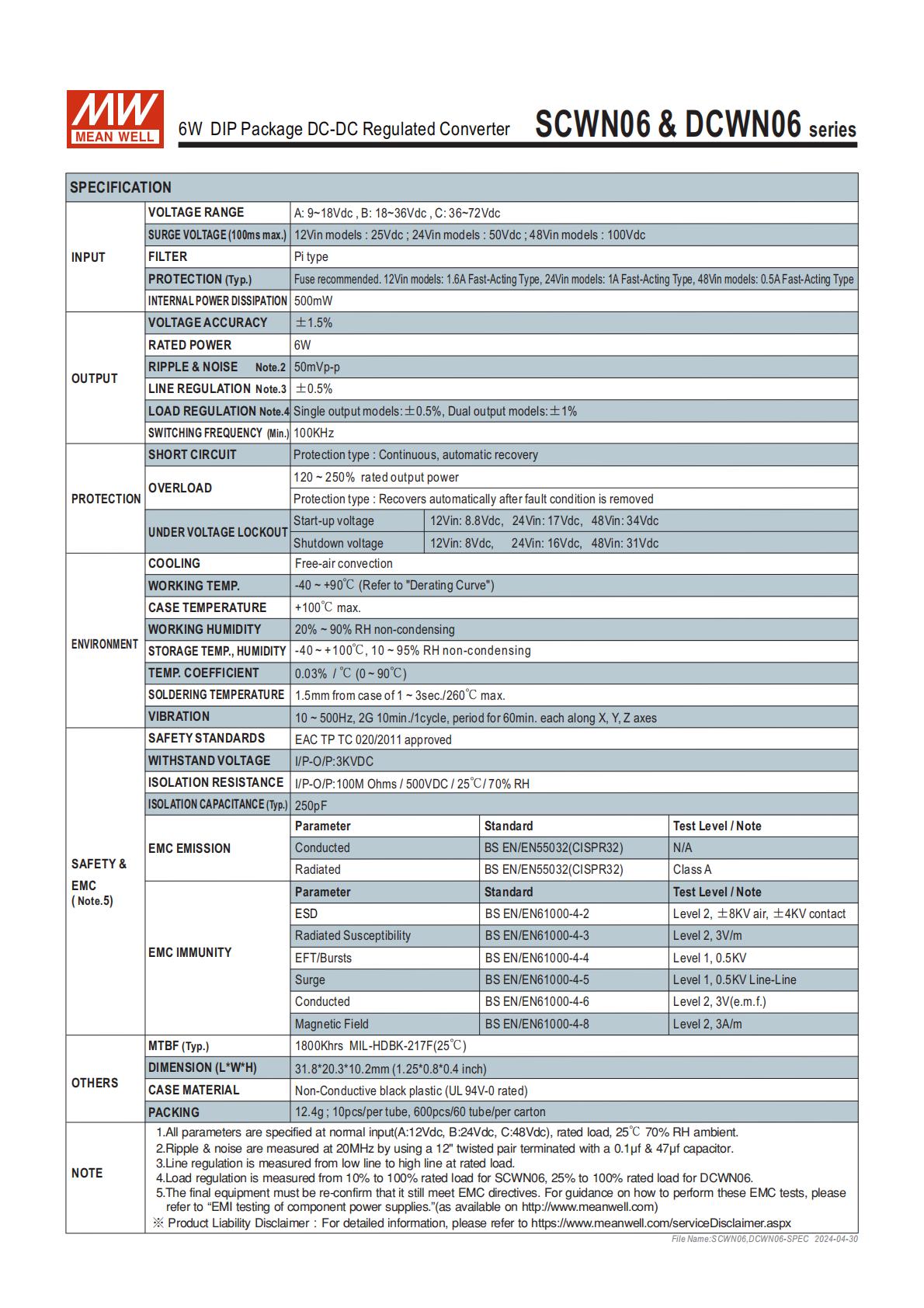 輸出類型:分單組輸出(SCWN06)和雙組輸出(DCWN06),單組為 3.3V/5V/12V/15V,雙組為 ±5V/±12V/±15V;最大電容負載單組4700μF,雙組每路2200μF。