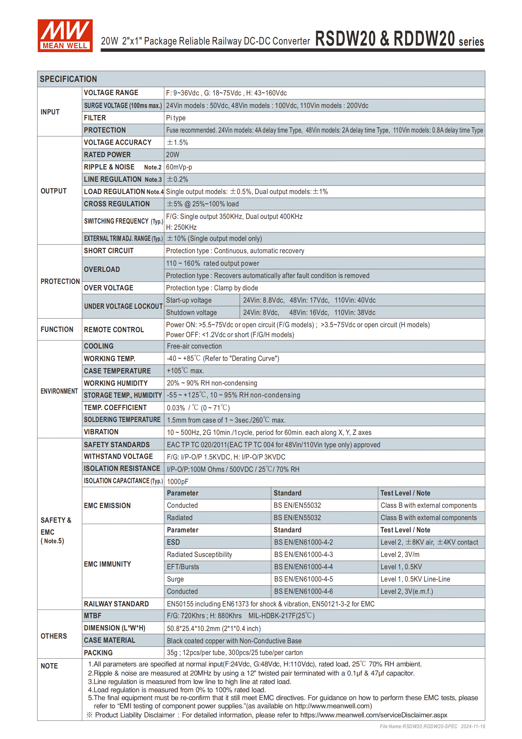 RSDW20/RDDW20 系列是明緯推出的20W鐵路用 DC-DC 轉(zhuǎn)換器,采用2"x1" 工業(yè)標準 DIP 封裝,符合EN50155 鐵路標準,具備4:1 寬輸入范圍(F:9~36Vdc、G:18~75Vdc、H:43~160Vdc),工作溫度覆蓋 **-40~+85℃,輸入輸出隔離電壓為1.5KVDC (F/G 型)/3KVDC (H 型),單 / 雙組輸出電壓可選且單組支持±10%** 外部調(diào)壓,效率最高達90%,擁有短路、過負載等多重自動恢復(fù)保護,支持遙控開 / 關(guān),自然風(fēng)冷散熱,適用于鐵路、工業(yè)控制等高振動、溫濕度惡劣的環(huán)境,提供3 年保固,MTBF 值 F/G 型達 720Khrs、H 型達 880Khrs。