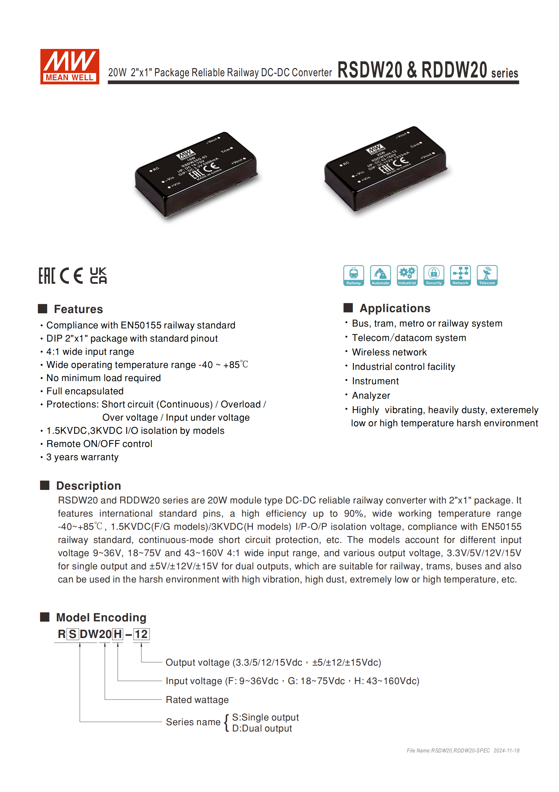 RSDW20/RDDW20 系列是明緯研發(fā)的20W模塊型 DC-DC 轉(zhuǎn)換器,專為鐵路場景設(shè)計,同時適配工業(yè)控制、通信等惡劣工作環(huán)境,核心標識為S(單組輸出)/D(雙組輸出),采用2"x1" 工業(yè)標準 DIP 封裝,符合EN50155 鐵路標準(含 EN61373 沖擊振動、EN50121-3-2 電磁兼容),提供3 年保固,是無最小負載要求的封閉型轉(zhuǎn)換器,支持自然風(fēng)冷。