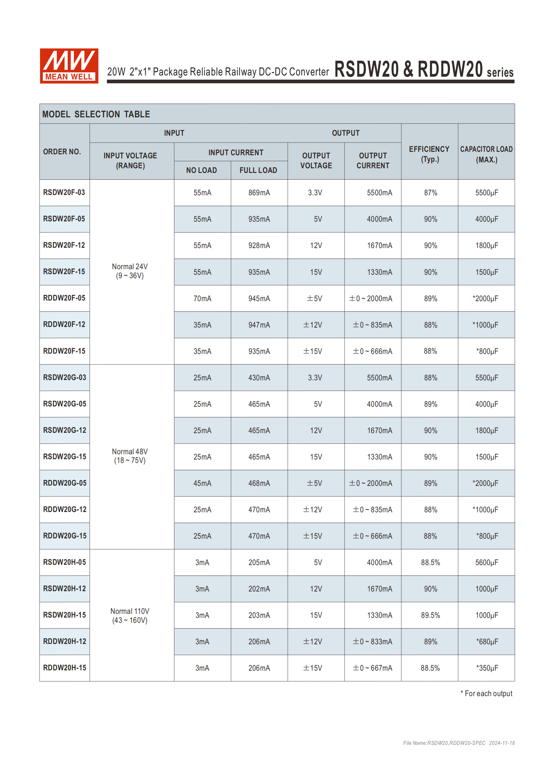 | RSDW20F-03 | 9~36Vdc | 3.3Vdc | 88% |