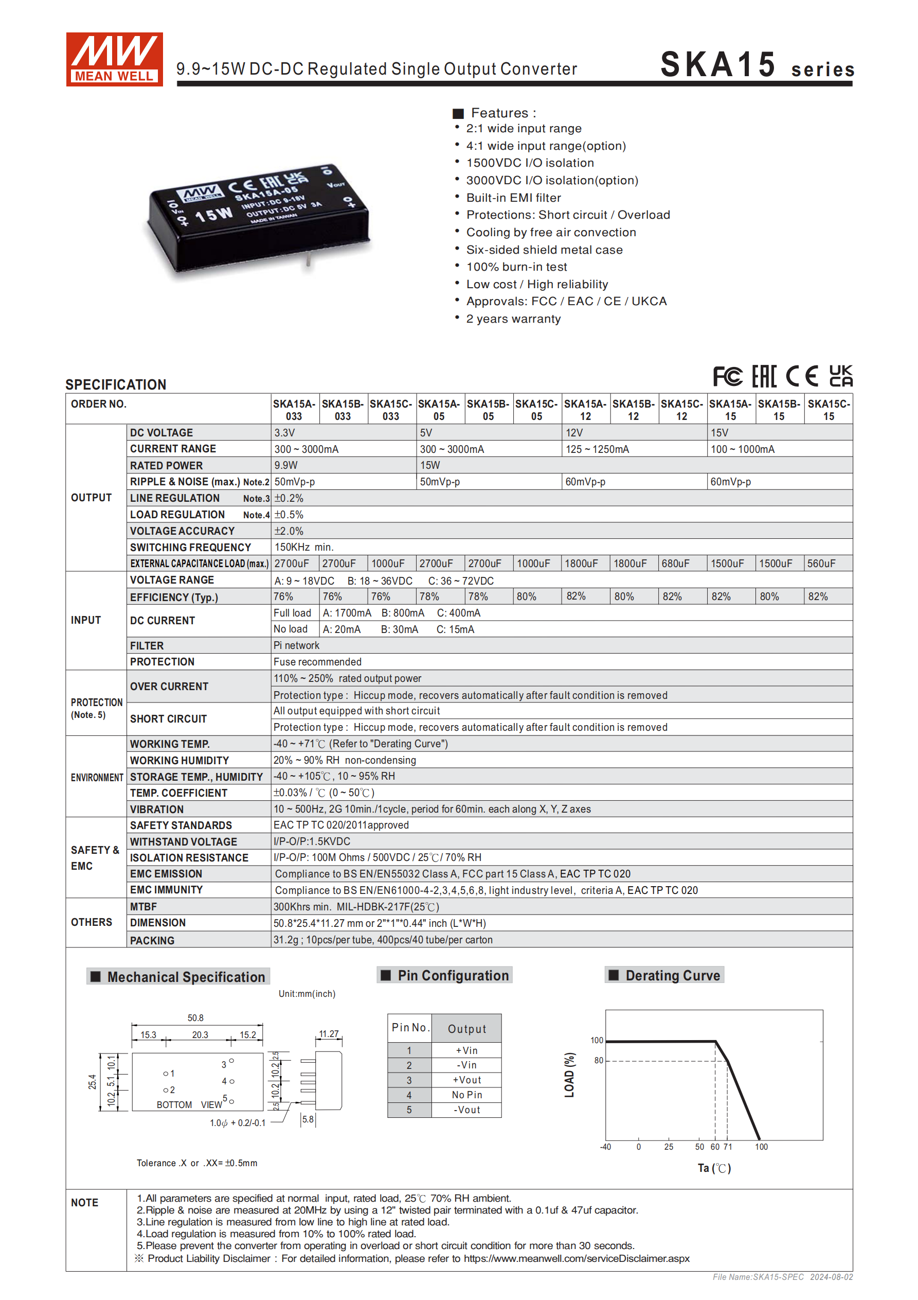 SKA15 系列為 9.9~15W DC-DC 穩(wěn)壓?jiǎn)谓M輸出轉(zhuǎn)換器,具備2:1/4:1 寬范圍輸入、1500/3000VDC 可選輸入輸出隔離等核心特性,內(nèi)置 EMI 濾波,支持短路 / 過負(fù)載打嗝模式保護(hù)且可自恢復(fù),金屬外殼六面防護(hù),經(jīng) FCC/EAC/CE/UKCA 認(rèn)證,2 年保固;電氣規(guī)格分 A/B/C 三類輸入電壓段,輸出 3.3V/5V/12V/15V 多種規(guī)格,工作溫度 **-40~+71℃,MTBF≥300Khrs,尺寸為50.825.411.27mm**,自然冷卻且 100% 滿載老化,兼具低成本與高可靠性。