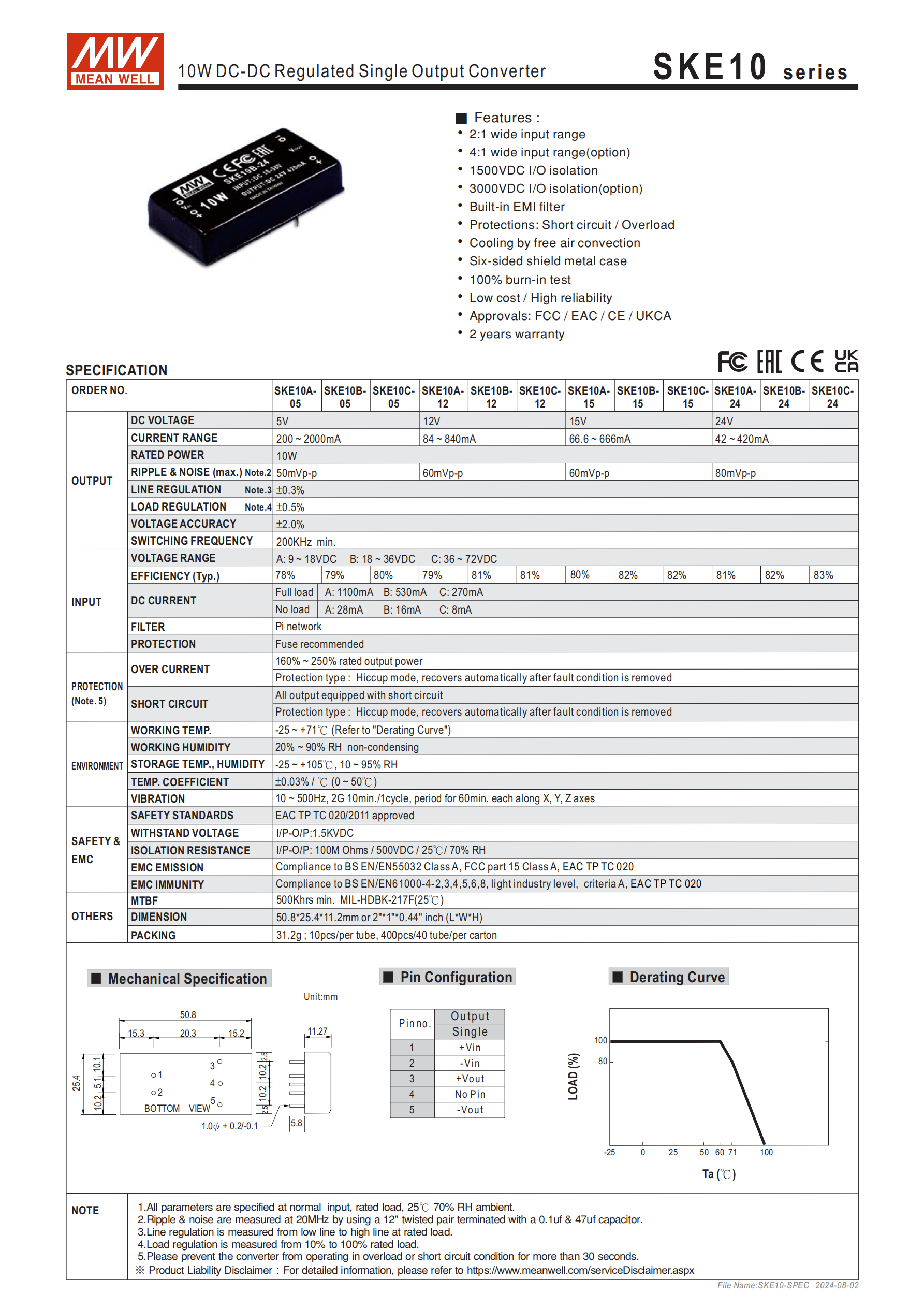 | SKE10B-15 | 15VDC | 81% | SKE10B-24 | 24VDC | 83% |