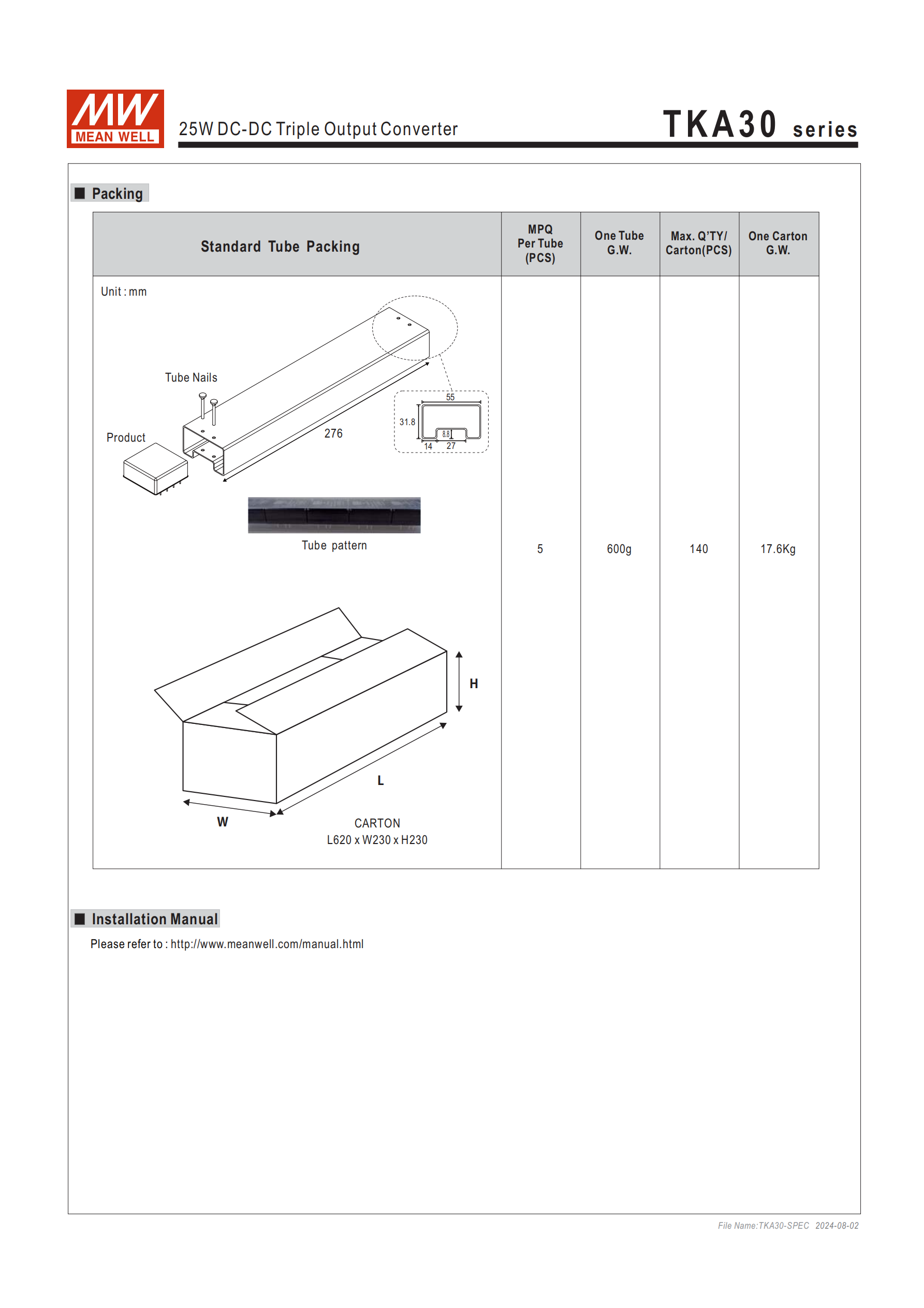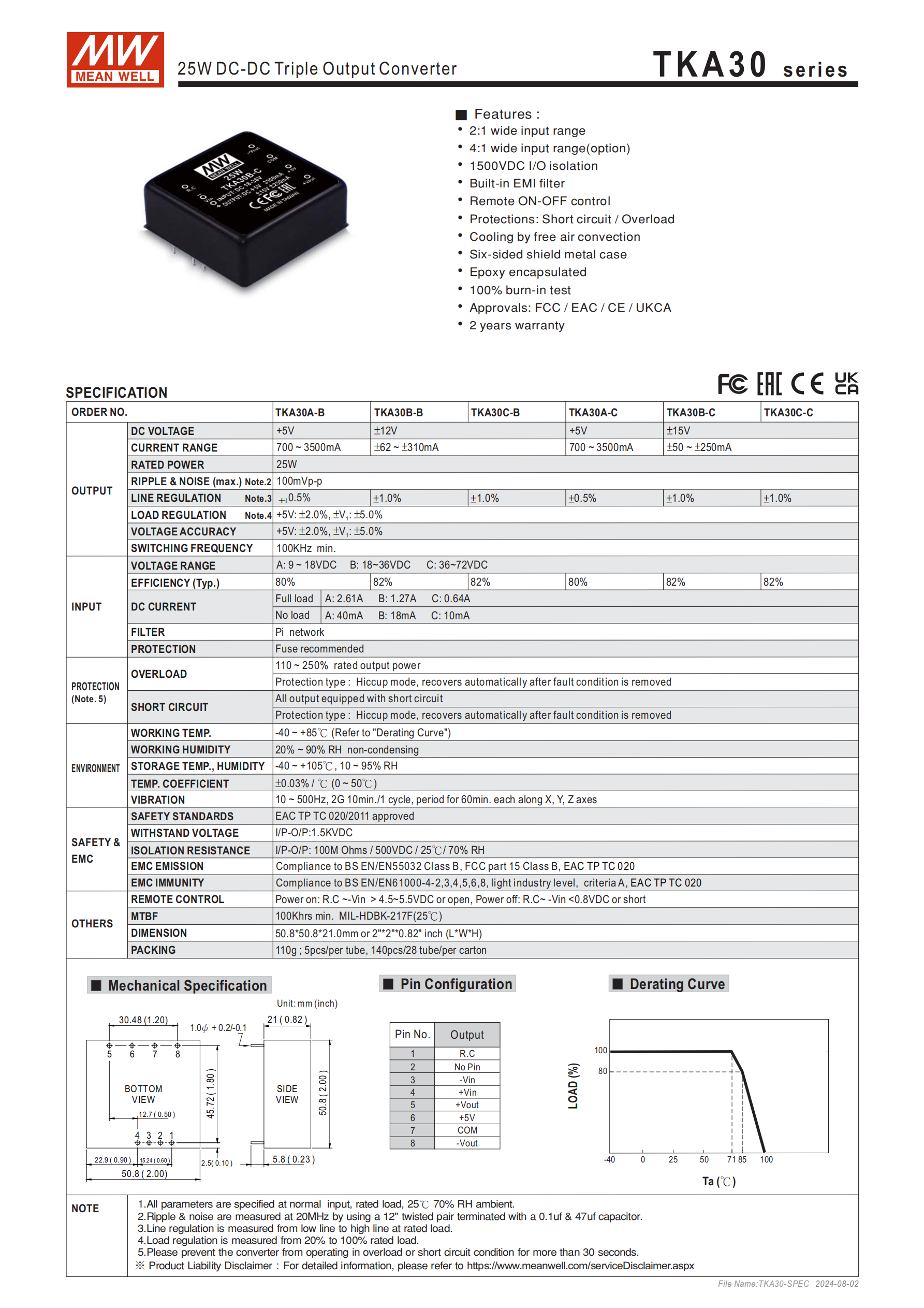 TKA30 系列為明緯生產(chǎn)的25W DC-DC 三組輸出轉(zhuǎn)換器,是全球交易品項(xiàng),核心定位為工業(yè)級(jí)直流轉(zhuǎn)換器件,完成100% 滿載老化測試,提供2 年保固,平均無故障工作時(shí)間MTBF≥100Khrs(依據(jù) MIL-HDBK-217F,25℃環(huán)境),采用自然冷卻方式,無需額外散熱配件。