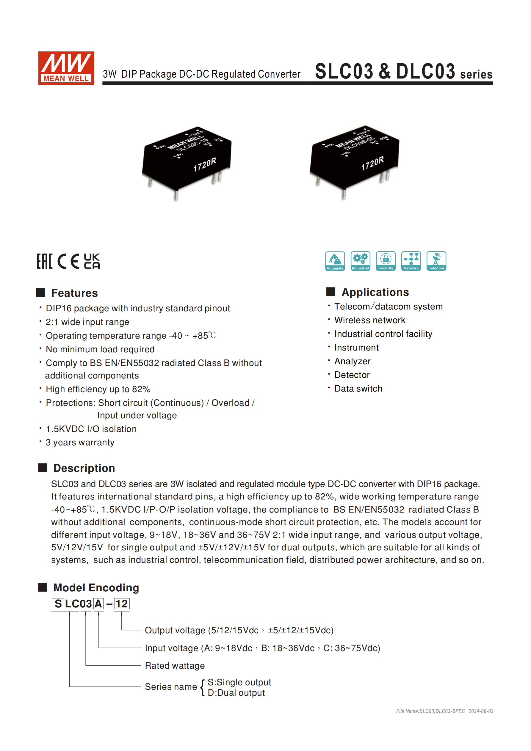 SLC03&DLC03 系列是明緯生產(chǎn)的3W DIP16 封裝隔離型 DC-DC 穩(wěn)壓轉(zhuǎn)換器,采用工業(yè)標(biāo)準(zhǔn)引腳設(shè)計(jì),為電信、工業(yè)控制等領(lǐng)域提供電源解決方案,核心優(yōu)勢(shì)為寬輸入、高隔離、多保護(hù)且電磁兼容性能優(yōu)異,提供3 年保固,MTBF 達(dá)300Khrs(MIL-HDBK-217F,25℃)。