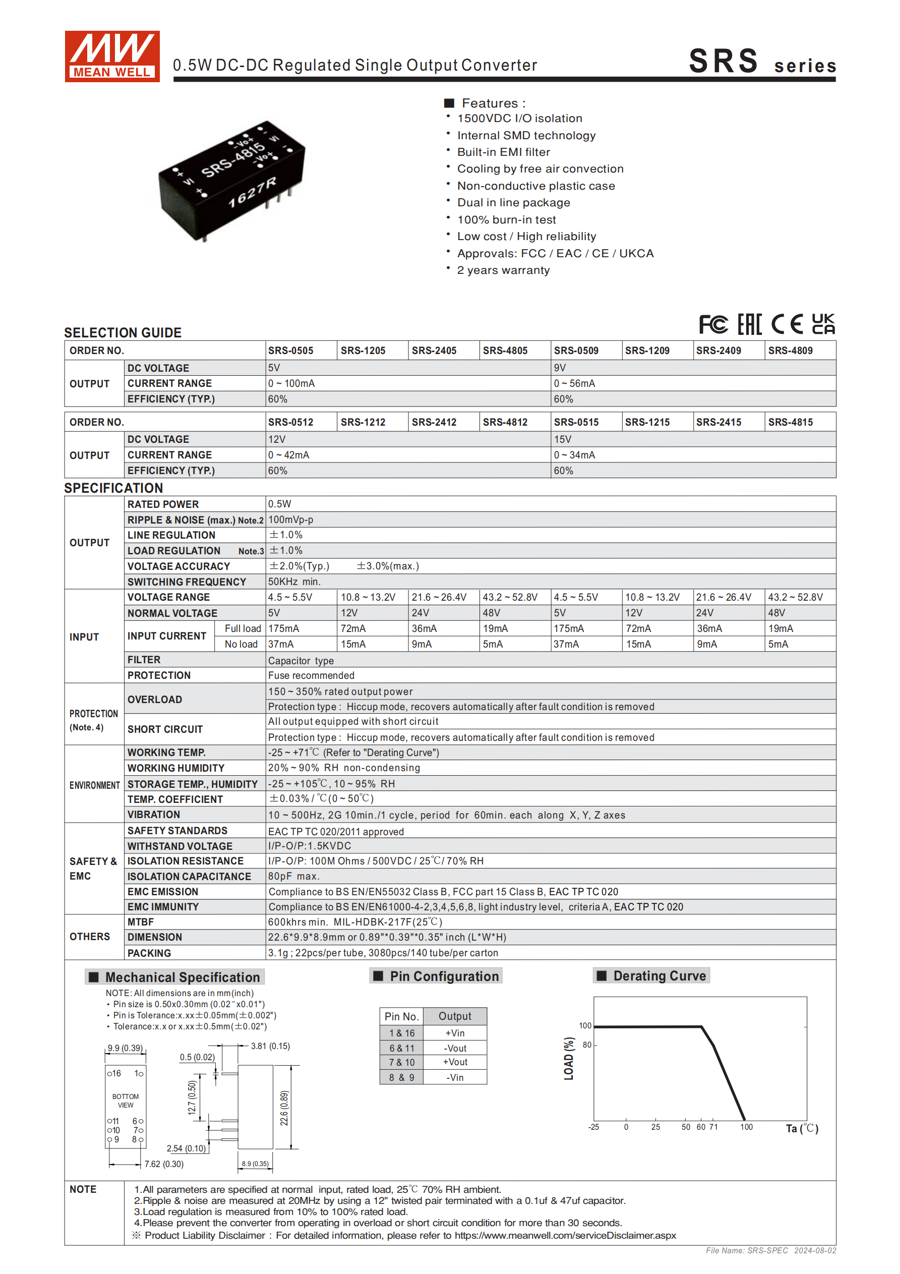 本文檔為明緯SRS 系列 0.5W DC-DC 穩(wěn)壓單組輸出轉(zhuǎn)換器的產(chǎn)品規(guī)格書,詳細介紹了該系列產(chǎn)品的特性、電氣規(guī)格、保護功能、環(huán)境參數(shù)、安規(guī)電磁兼容、物理尺寸及包裝等核心信息,同時明確了測試標準與使用備注,以下為分點詳細總結(jié):