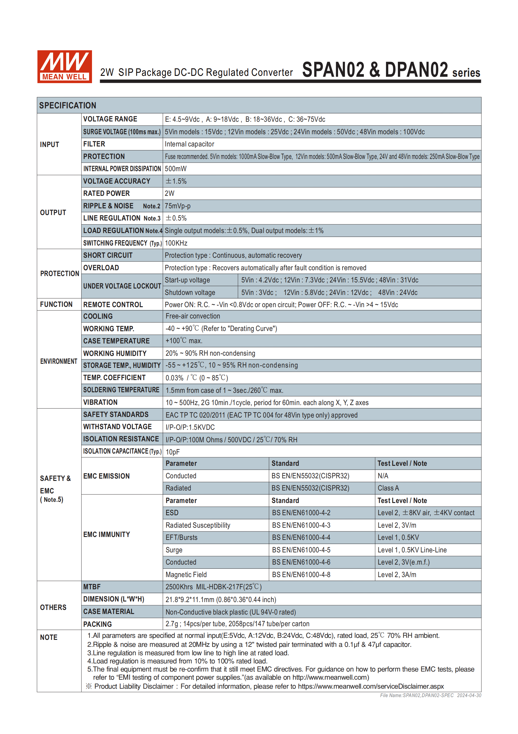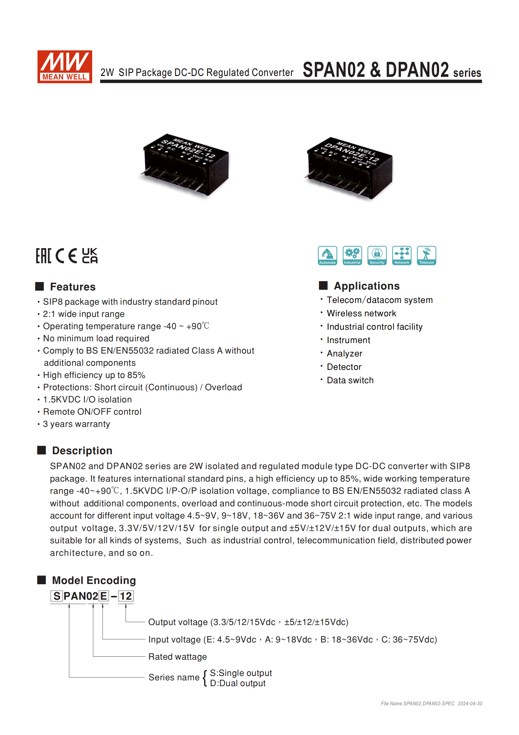 SPAN02/DPAN02 系列是明緯推出的2W SIP8 封裝DC-DC 穩(wěn)壓轉(zhuǎn)換器,分單組(SPAN02)和雙組(DPAN02)輸出類型,具備4.5~9V/9~18V/18~36V/36~75V 四檔 2:1 寬輸入范圍,輸出涵蓋 3.3V/5V/12V/15V 單路及 ±5V/±12V/±15V 雙路,核心特性包含1.5KVDC 輸入輸出隔離、-40~+90℃寬工作溫度、85% 最高效率,支持遙控開(kāi) / 關(guān),擁有連續(xù)短路、過(guò)載自恢復(fù)保護(hù),符合BS EN/EN55032 輻射 A 級(jí)標(biāo)準(zhǔn)且無(wú)需額外組件,適用于電信 / 工業(yè)控制 / 儀器等領(lǐng)域,提供3 年保固,MTBF 達(dá) 2500Khrs,尺寸為21.89.211.1mm。