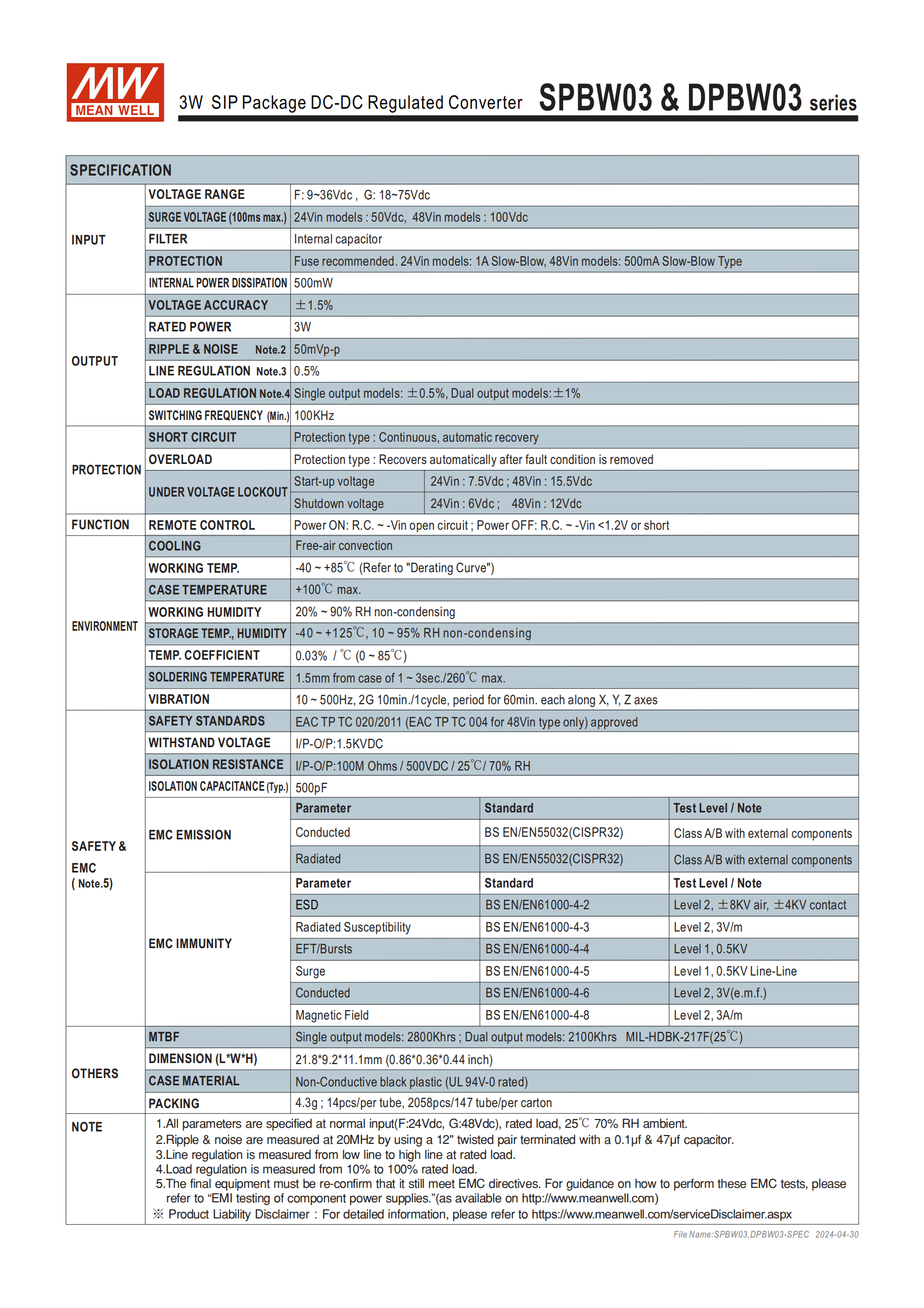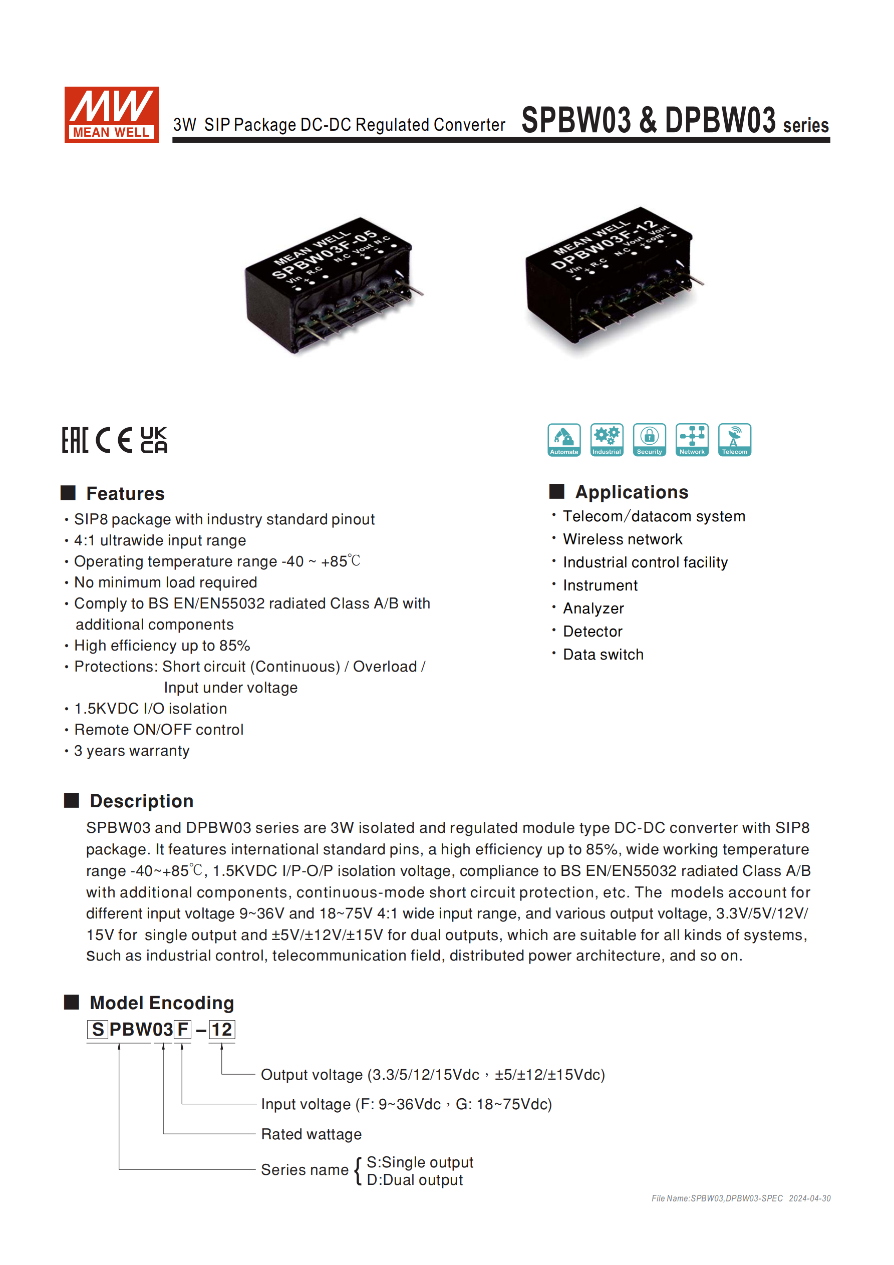 SPBW03&DPBW03 系列是明緯推出的3W SIP8 封裝隔離穩(wěn)壓 DC-DC 轉(zhuǎn)換器,具備4:1 超寬輸入范圍(F 型 9~36Vdc、G 型 18~75Vdc)、1.5KVDC 輸入輸出隔離,工作溫度覆蓋 **-40~+85℃,效率最高達(dá)85%**,支持單 / 雙組多電壓輸出,擁有短路、過(guò)負(fù)載、輸入欠壓全保護(hù)且無(wú)需最小負(fù)載,還具備遙控開 / 關(guān)功能,符合 BS EN/EN55032 輻射 A 級(jí)(外加零件可實(shí)現(xiàn) Class A/B),適配電信、工業(yè)控制等多領(lǐng)域,提供 3 年保固,MTBF 單組輸出達(dá) 2800Khrs、雙組輸出 2100Khrs。