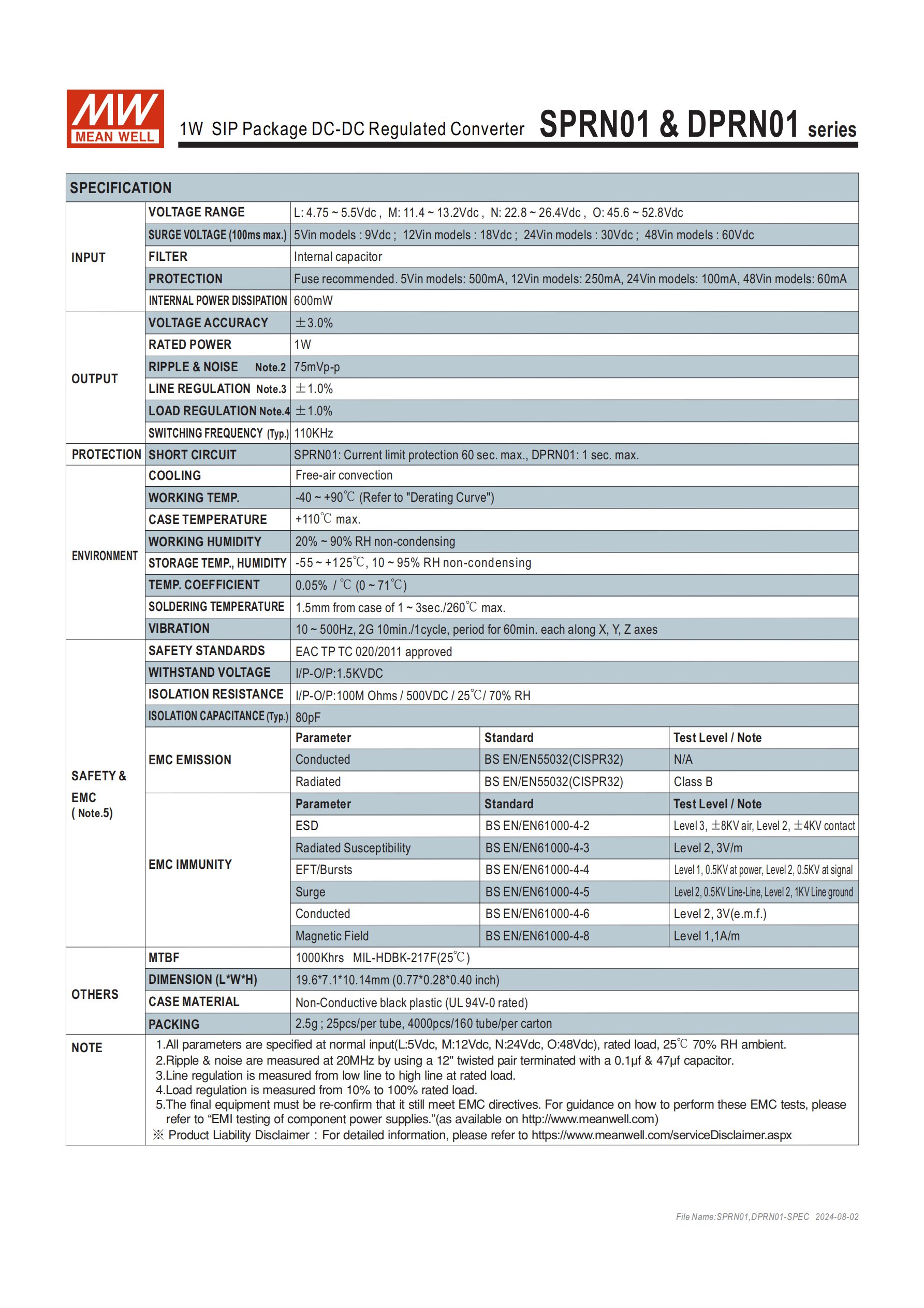 SPRN01& DPRN01 系列為明緯研發(fā)的1W SIP6 封裝隔離穩(wěn)壓型 DC-DC 轉(zhuǎn)換器,采用國際標(biāo)準(zhǔn)引腳設(shè)計(jì),主打高適配性、寬溫工作與可靠保護(hù),適用于分布式電源架構(gòu),是電信、工業(yè)控制等領(lǐng)域的通用型電源模塊,提供3 年保固,為全球交易品項(xiàng)。