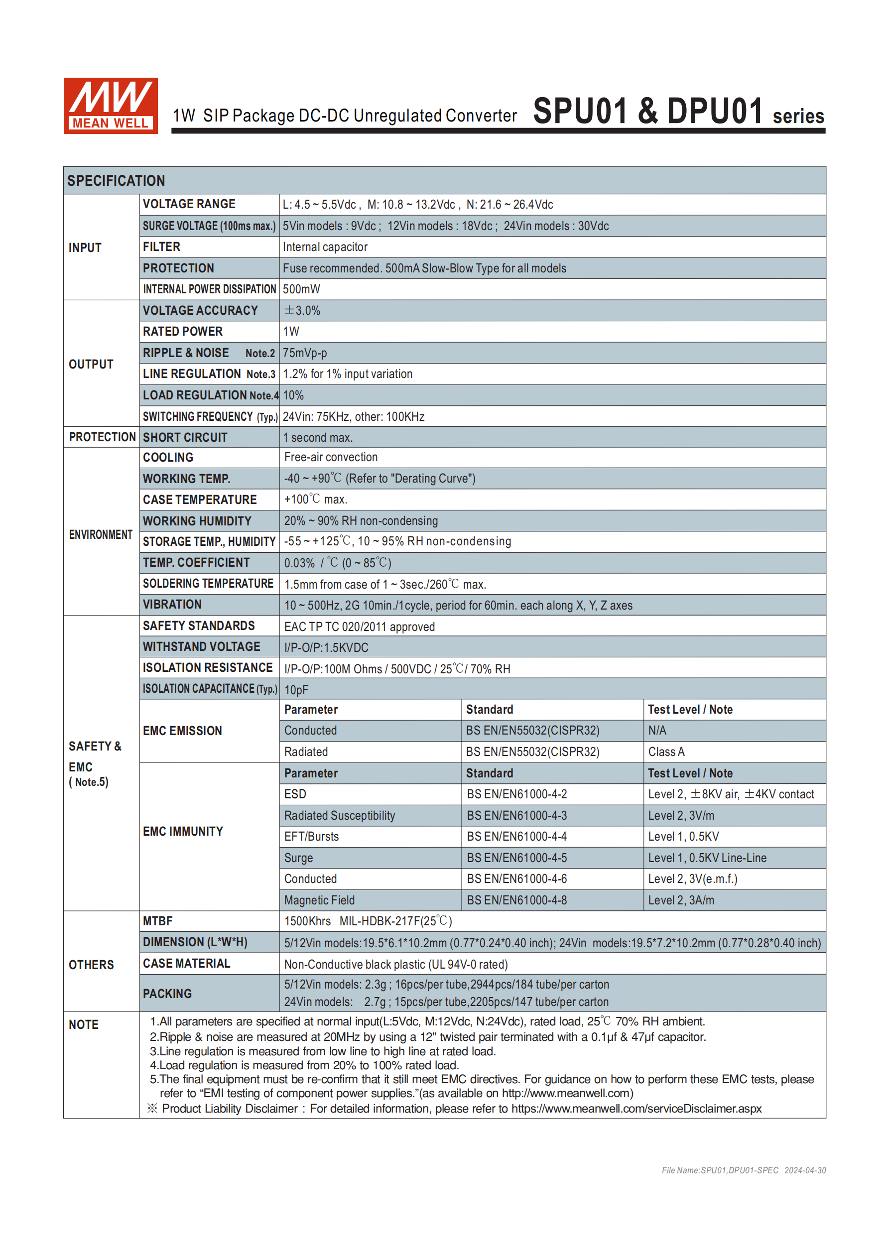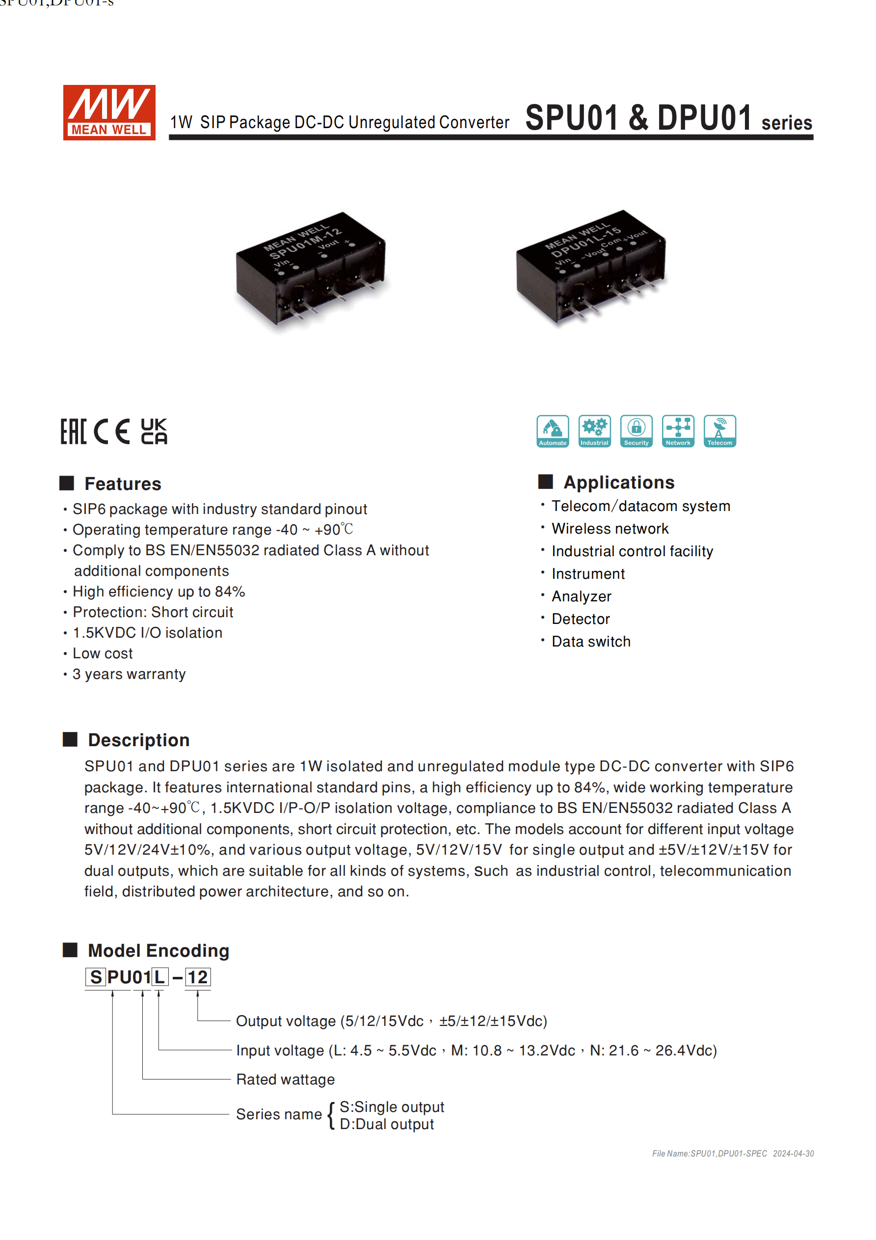 SPU01&DPU01 系列為明緯生產(chǎn)的1W SIP6 封裝DC-DC 非穩(wěn)壓模塊型轉(zhuǎn)換器,分單組輸出(SPU01)和雙組輸出(DPU01)兩大類(lèi)型,采用國(guó)際標(biāo)準(zhǔn)引腳,主打低成本、高可靠性,適配工業(yè)、通信等多領(lǐng)域分布式電源架構(gòu),提供3 年保固,是全球交易品項(xiàng)。