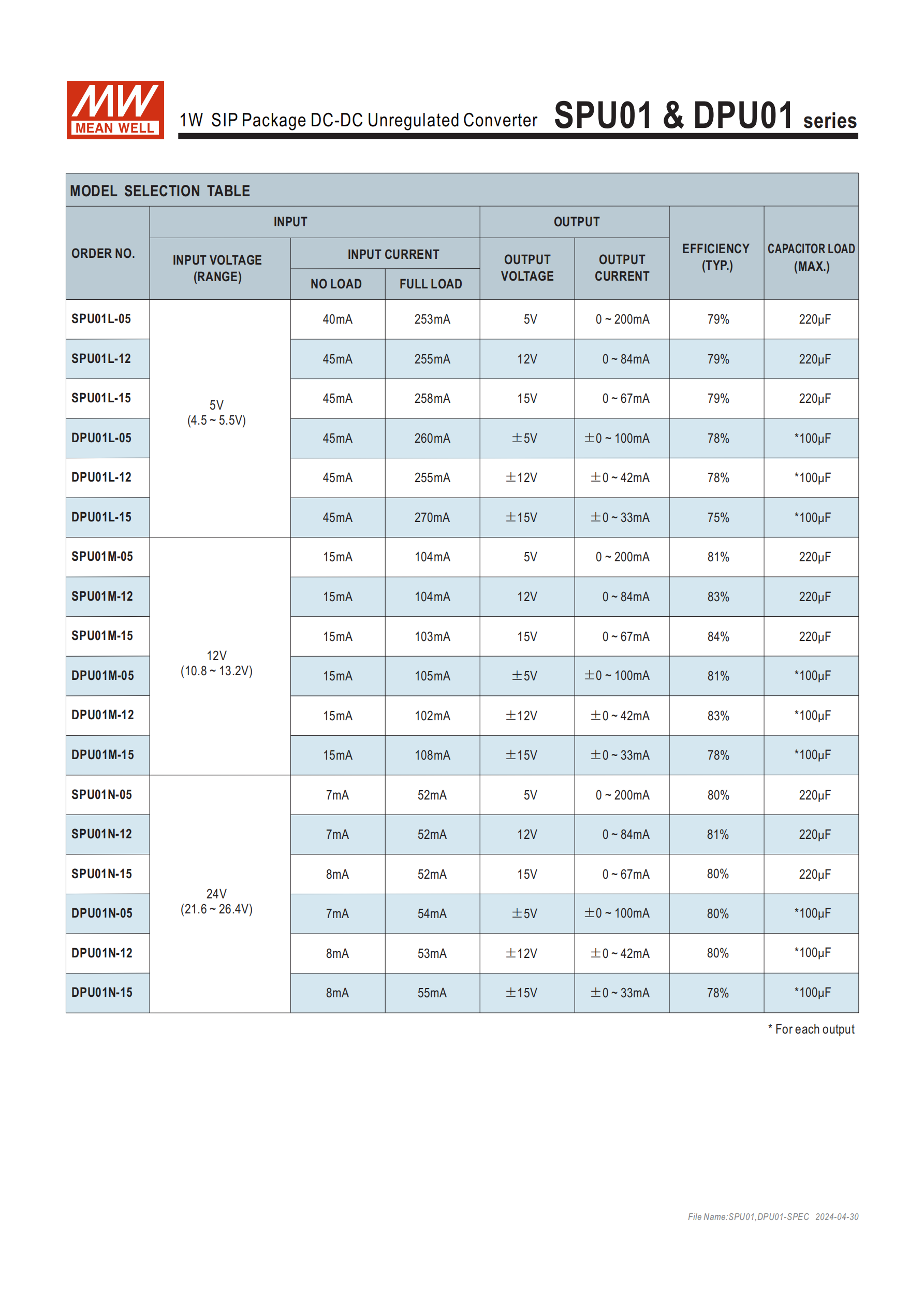 | SPU01L-05 | 4.5~5.5V | 5V/0~200mA | 79% | 220μF |
