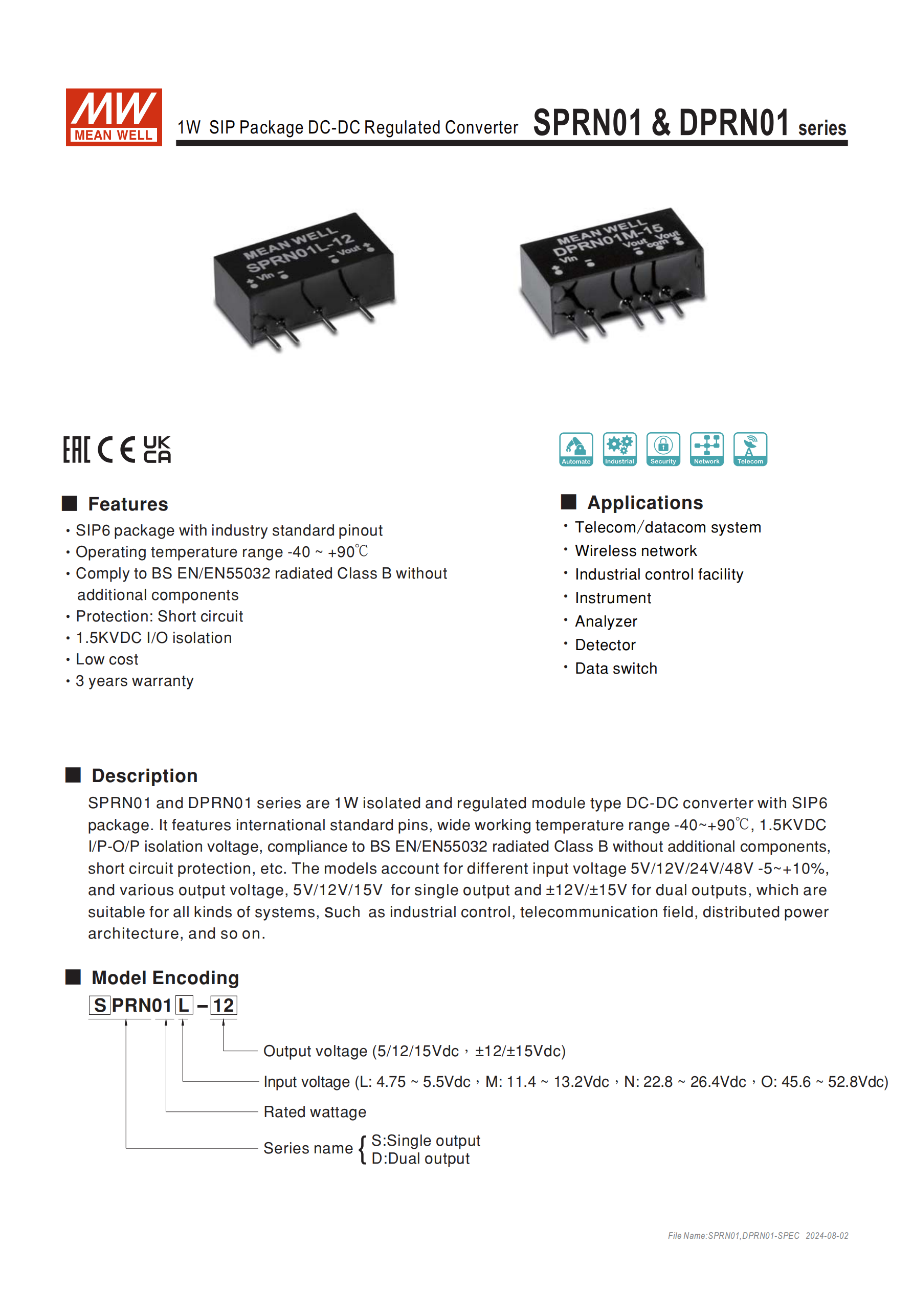 SPRN01&DPRN01 系列為明緯生產(chǎn)的1W SIP6 封裝隔離穩(wěn)壓型 DC-DC 轉換器,是面向工業(yè)、通信領域的模塊化電源產(chǎn)品,采用國際標準引腳設計,價格低廉且提供3 年保固,MTBF(平均無故障時間)達1000Khrs(25℃,MIL-HDBK-217F 標準)。