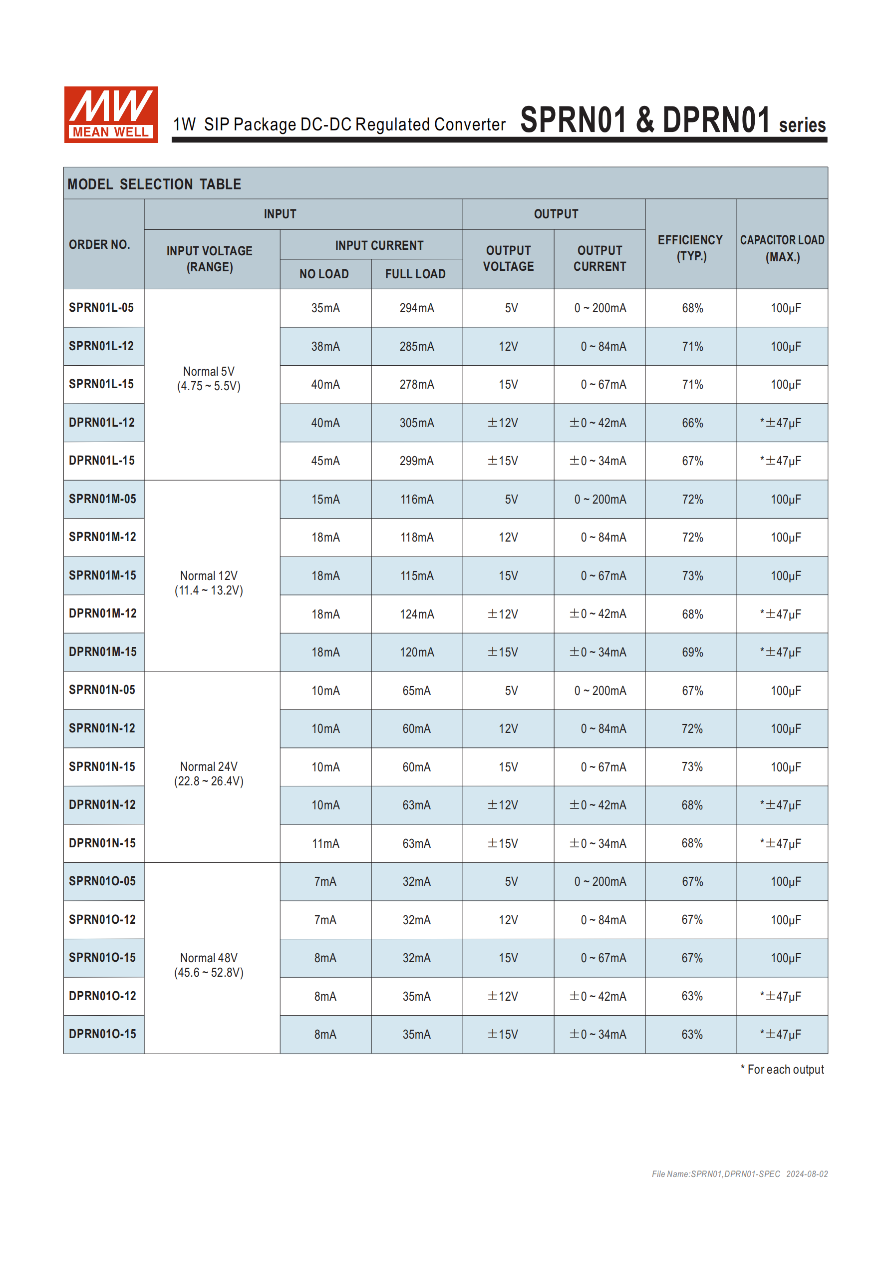 答案:核心區(qū)別為輸出類型,SPRN01 為單組輸出,DPRN01 為雙組 ± 電壓輸出,且雙組輸出的電容負載為每路 ±47uF,單組為 100uF,雙組效率整體略低于單組;輸入電壓檔對應范圍為 L:4.75~5.5Vdc、M:11.4~13.2Vdc、N:22.8~26.4Vdc、O:45.6~52.8Vdc。