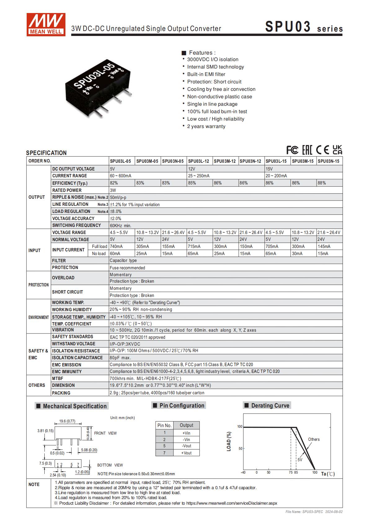 SPU03 系列為明緯生產(chǎn)的3W DC-DC 不穩(wěn)壓單組輸出轉(zhuǎn)換器,是低成本、高可靠性的電源轉(zhuǎn)換器件,核心基礎(chǔ)特性如下: