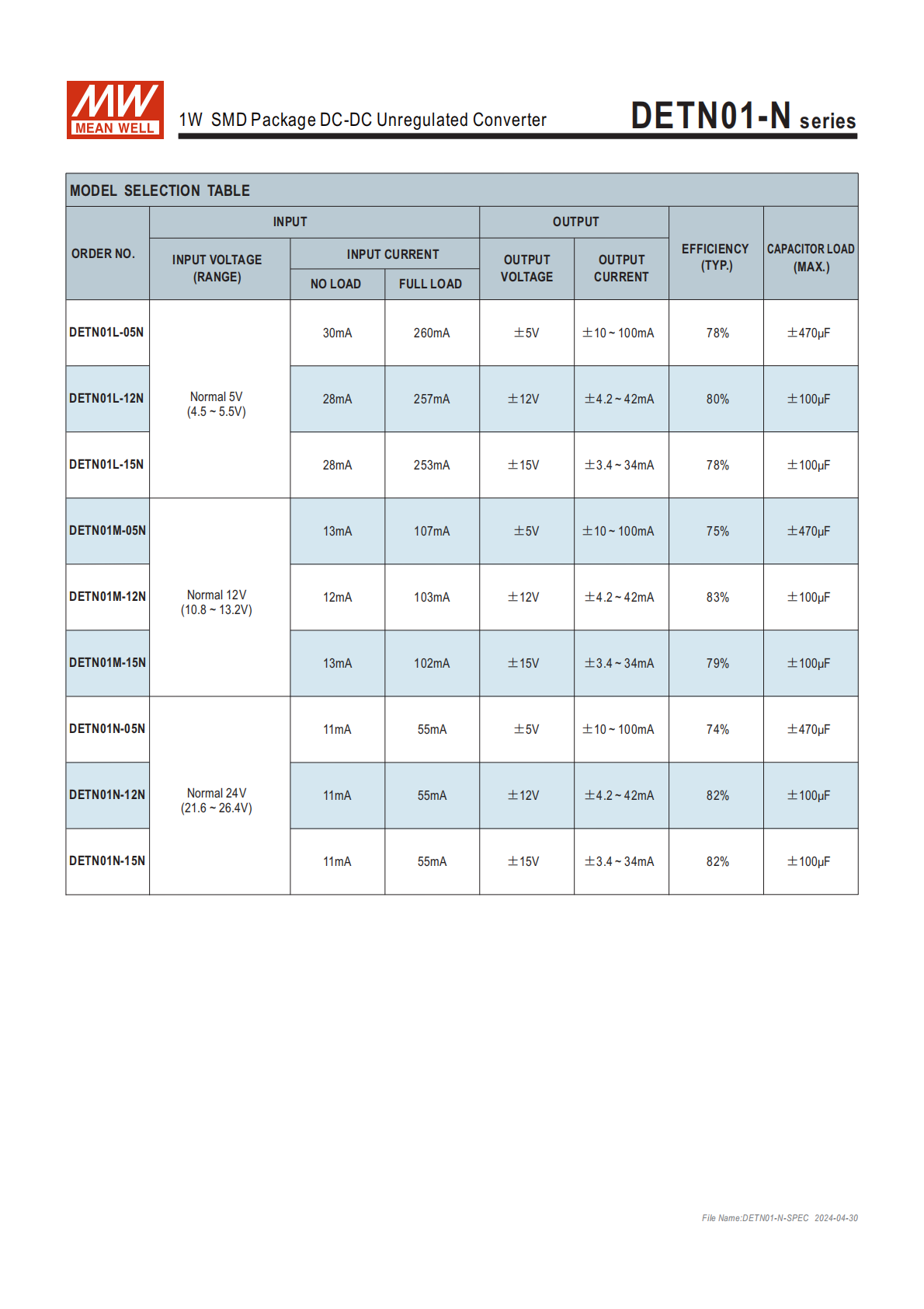 | DETN01N-12N | 21.6~26.4V | ±12V | ±4.2~42mA | 11mA | 82% | 100μF |