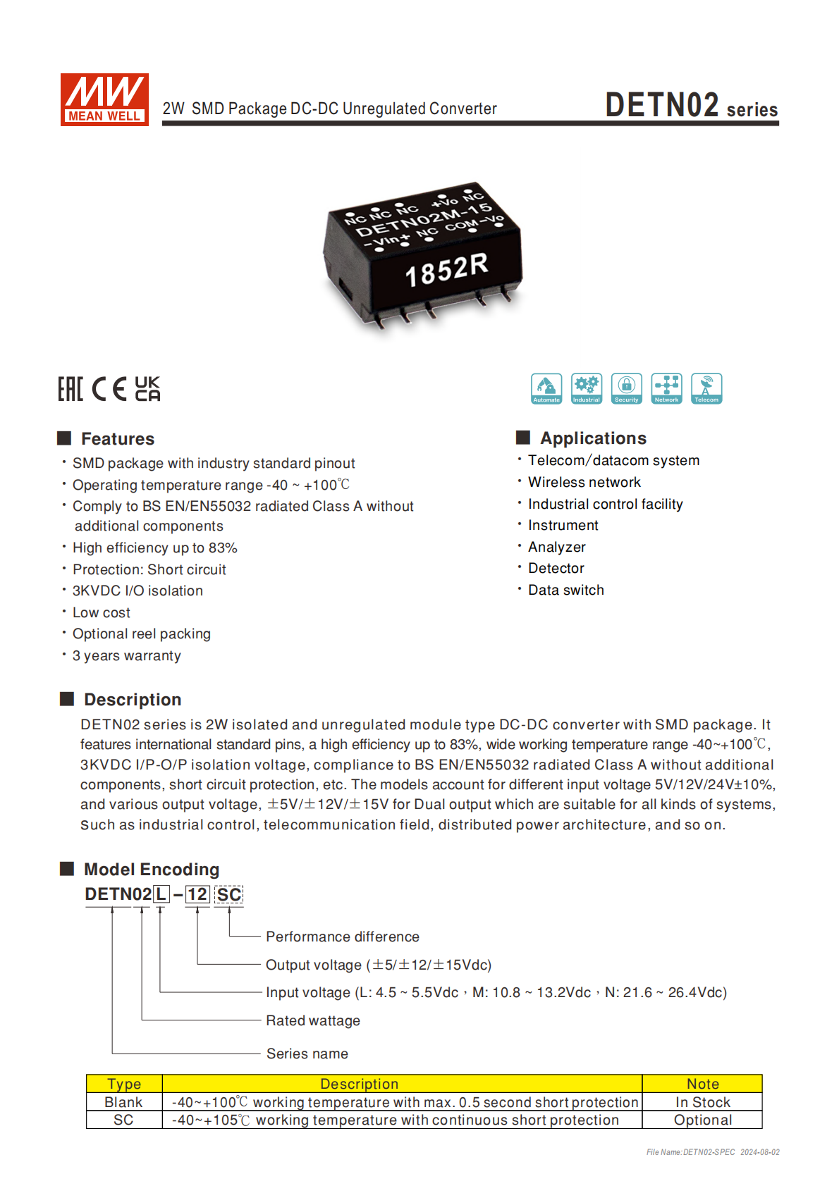 DETN02 系列是明緯推出的2W SMD 封裝DC-DC 非穩(wěn)壓轉(zhuǎn)換器,具備3KVDC 輸入 / 輸出隔離、-40~+100℃寬工作溫度、最高83%的轉(zhuǎn)換效率及短路保護功能,輸入電壓分4.5~5.5V、10.8~13.2V、21.6~26.4V三檔,輸出為 **±5/±12/±15Vdc雙組,符合BS EN/EN55032 輻射 A 級標(biāo)準(zhǔn),采用國際標(biāo)準(zhǔn)引腳,尺寸為15.2410.97.1mm**,適用于電信 / 工業(yè)控制 / 儀器等領(lǐng)域,提供 3 年保固,有套管和卷盤兩種包裝可選。