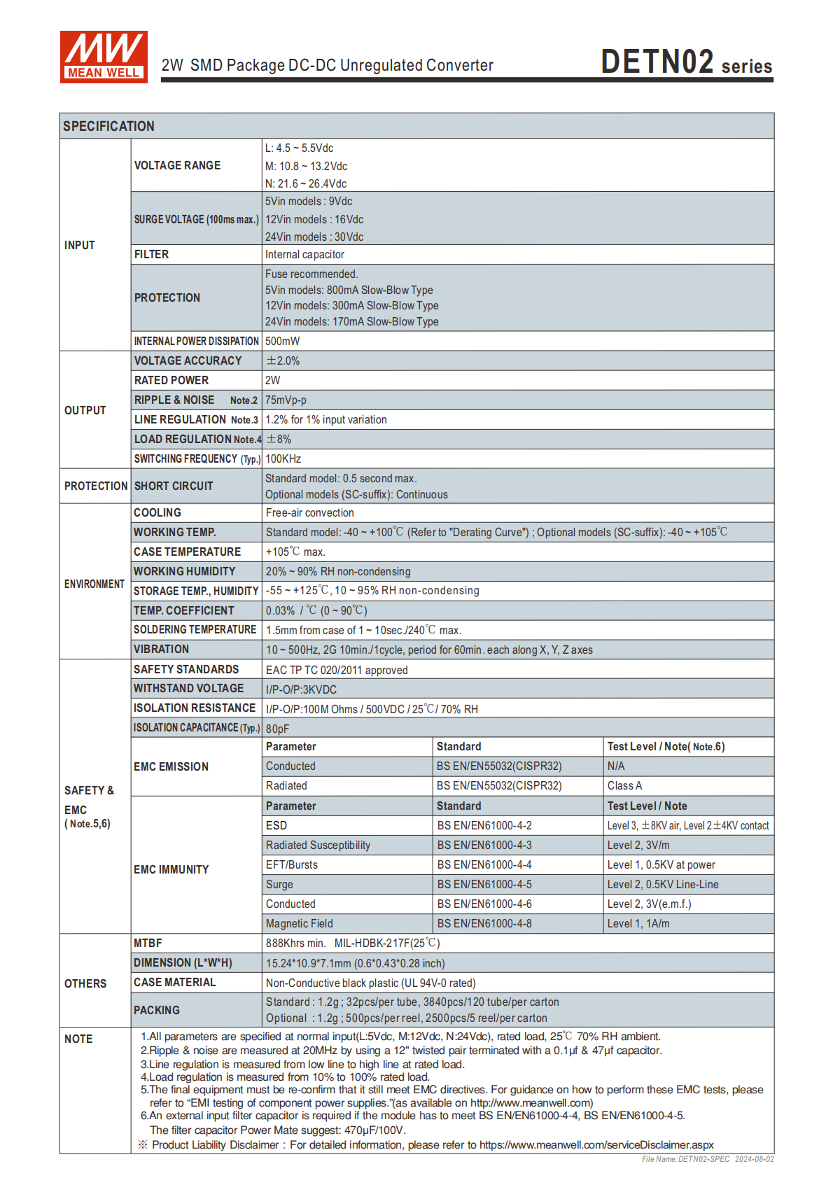 | DETN02M-12 | 10.8~13.2Vdc | ±12V | 30mA | 82% | 8~84mA± | 220μF |