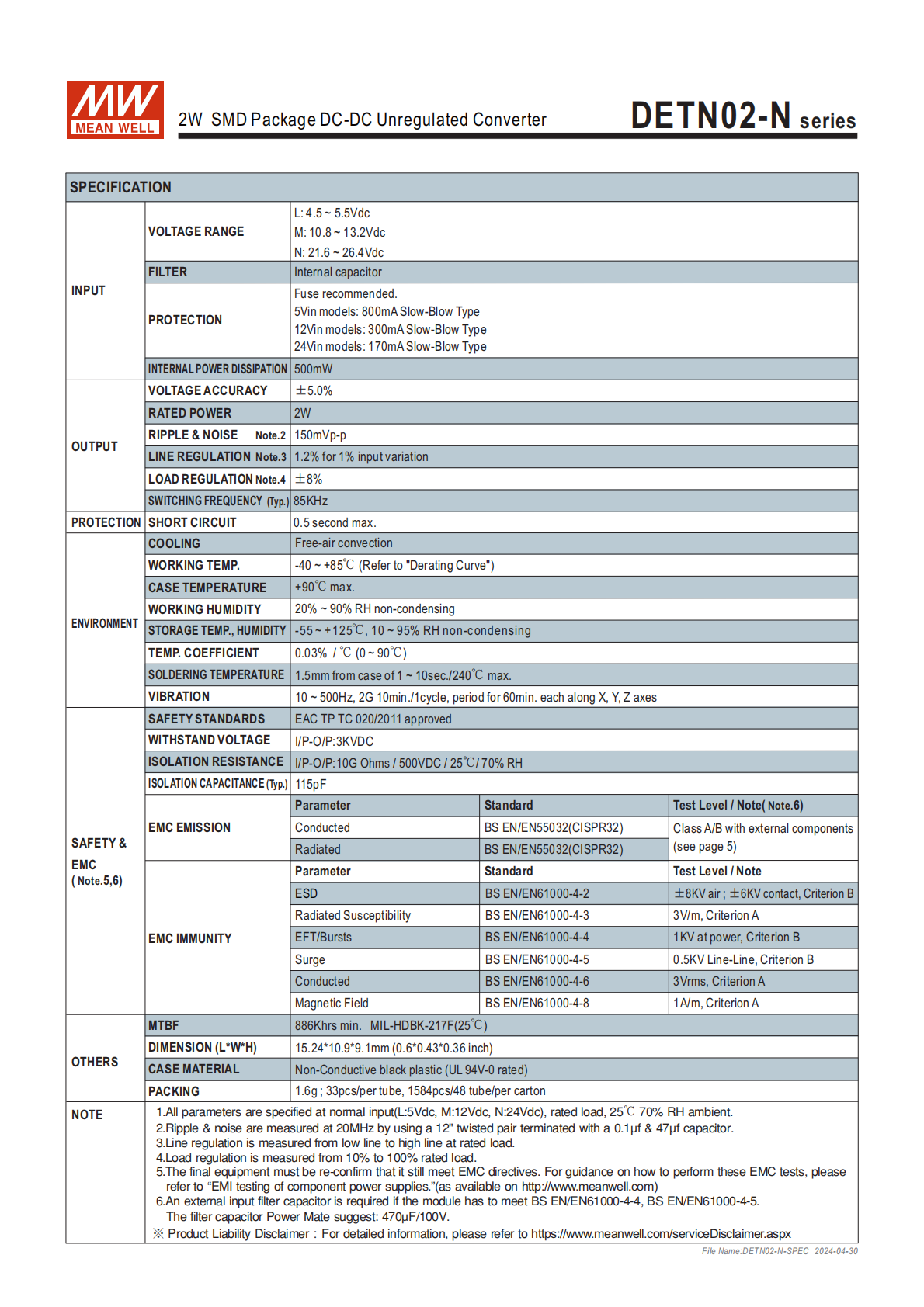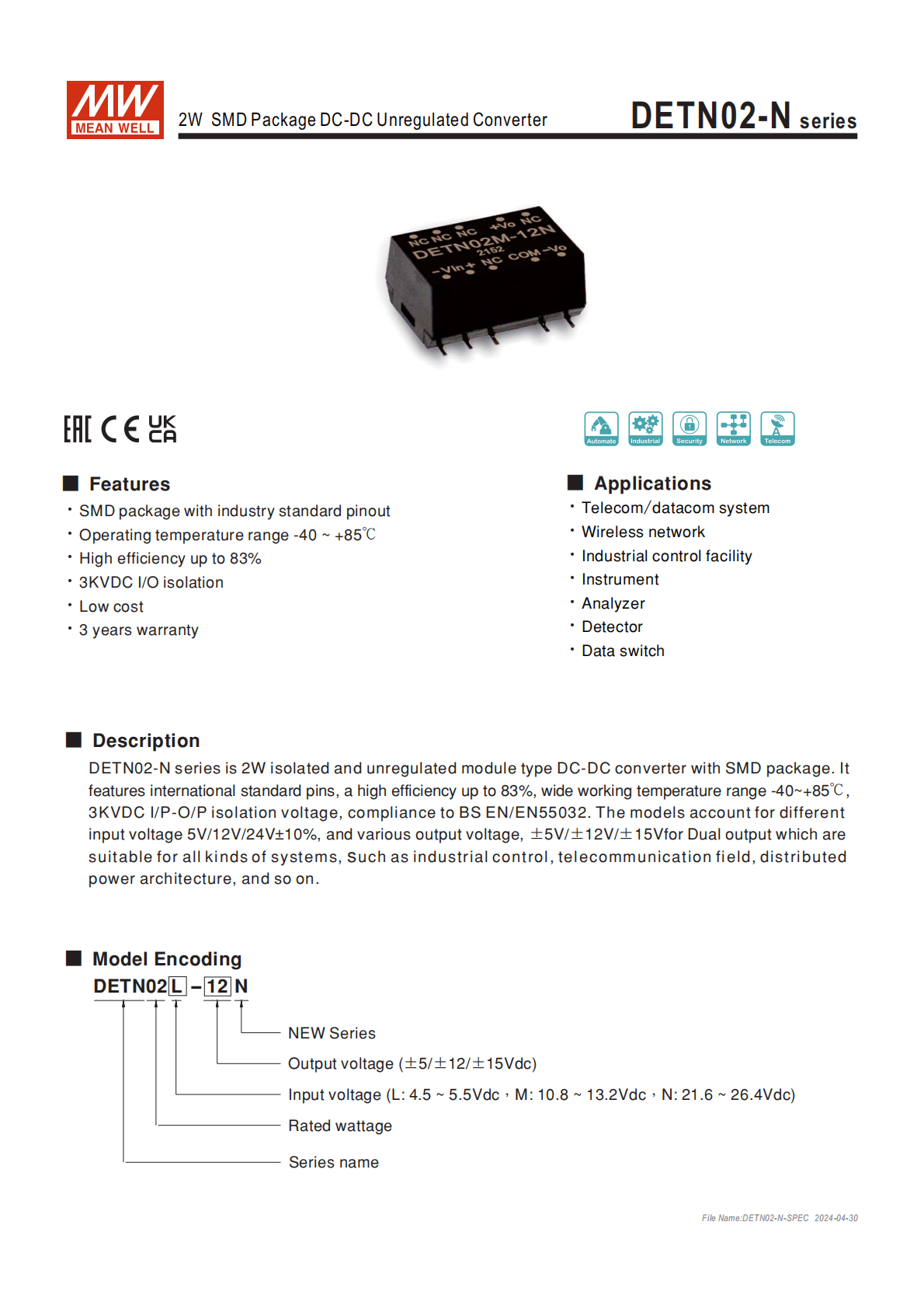 DETN02 系列是明緯推出的2W SMD 封裝DC-DC 非穩(wěn)壓轉(zhuǎn)換器,具備3KVDC 輸入 / 輸出隔離、-40~+100℃寬工作溫度、最高83%的轉(zhuǎn)換效率及短路保護功能,輸入電壓分4.5~5.5V、10.8~13.2V、21.6~26.4V三檔,輸出為 **±5/±12/±15Vdc雙組,符合BS EN/EN55032 輻射 A 級標準,采用國際標準引腳,尺寸為15.2410.97.1mm**,適用于電信 / 工業(yè)控制 / 儀器等領(lǐng)域,提供 3 年保固,有套管和卷盤兩種包裝可選。