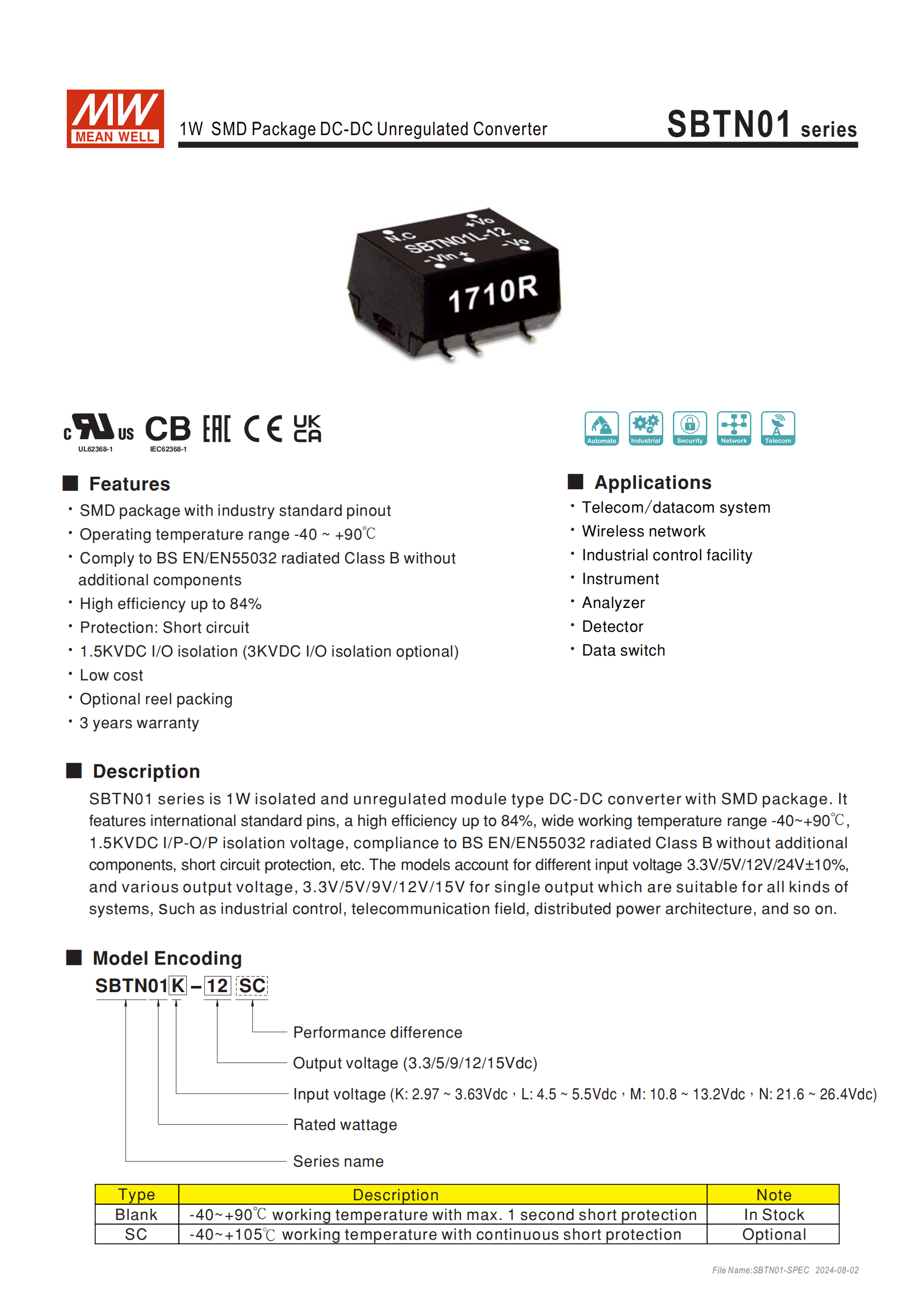 DETN02-N 系列是明緯推出的2W SMD 封裝DC-DC 非穩(wěn)壓轉(zhuǎn)換器,具備工業(yè)標準引腳,工作溫度覆蓋 **-40~+85℃,效率最高達83%,實現(xiàn)3KVDC輸入輸出隔離,提供5V/12V/24V三類輸入電壓范圍與±5V/±12V/±15V雙組輸出電壓選擇,適配電信通信、工業(yè)控制等多領(lǐng)域,通過相關(guān)安規(guī)與電磁兼容認證,擁有3 年保固 **,模塊尺寸為15.2410.99.1mm,采用套管式包裝,整體兼具高適配性、穩(wěn)定性與低成本優(yōu)勢。